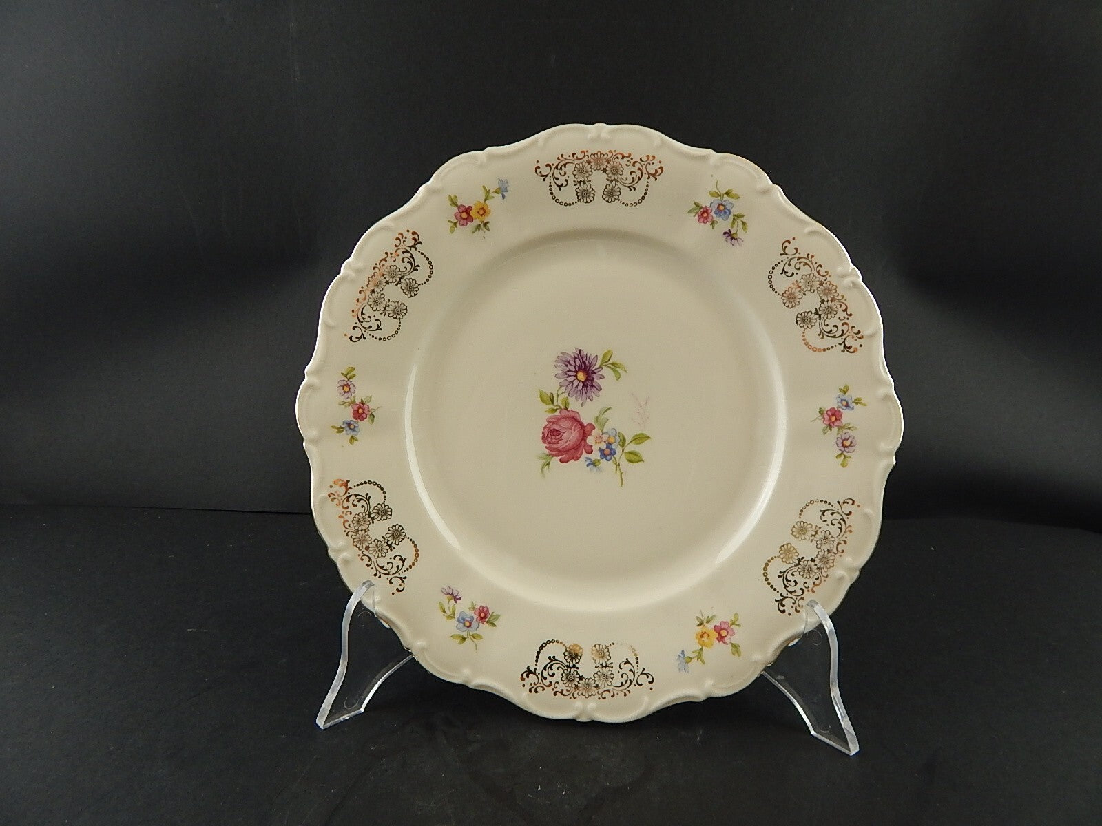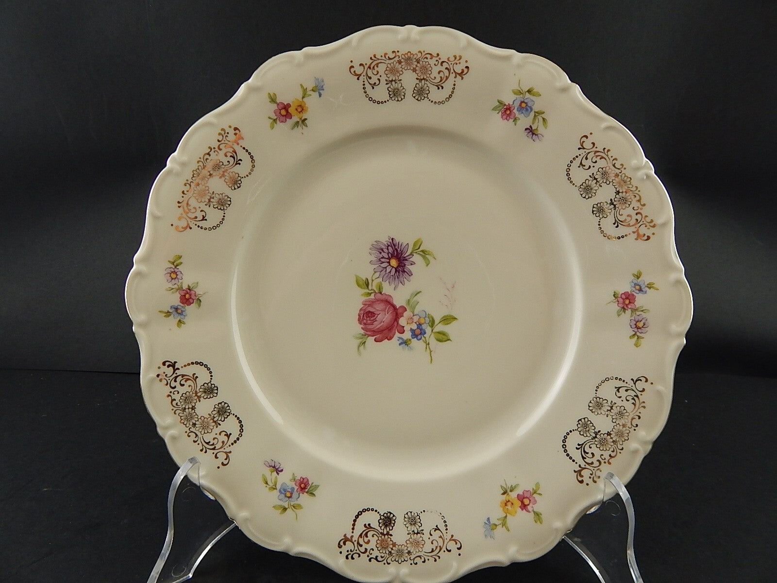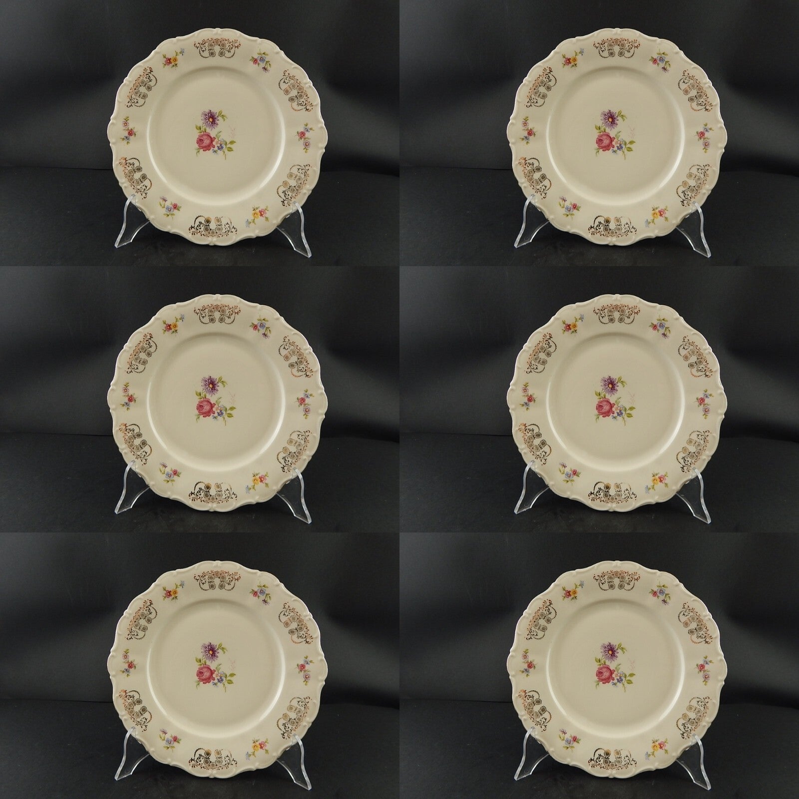 In questa inserzione viene presentato un servizio da tavola composto da 6 piatti piani realizzato negli anni '40 dalla manifattura tedesca Bavaria Seltmann Weiden-E nel modello Theresia. Il servizio in finissima porcellana color avorio è decorato a rocaille con arabeschi in oro zecchino e il bouquet centrale composto dalla rosa e dalla dalia.