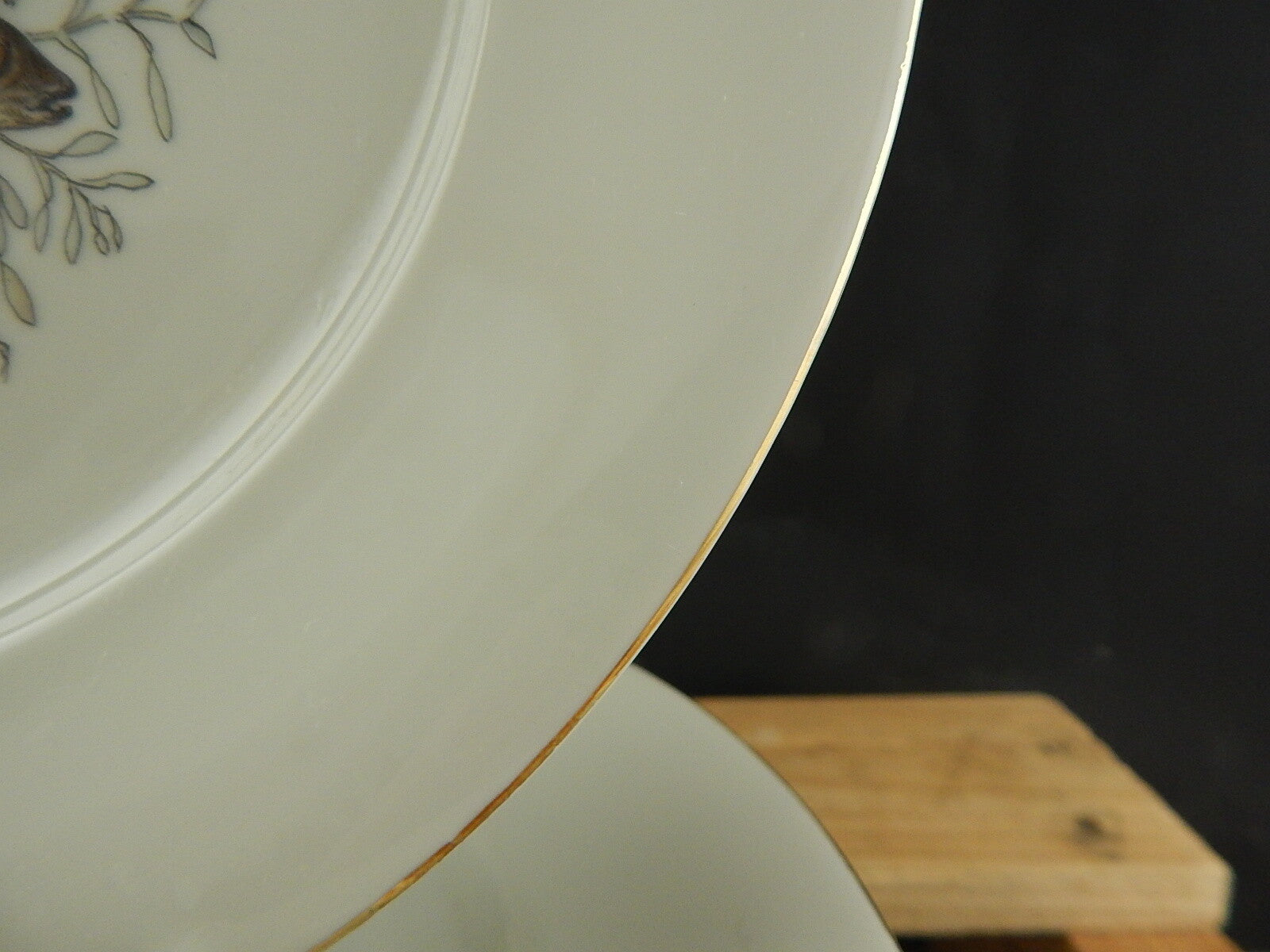 I piatti in porcellana bianca con profilo in oro sono decorati con figure di pesci e misurano 24 cm di diametro