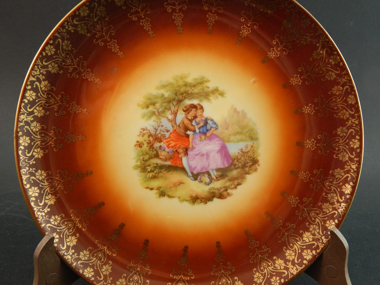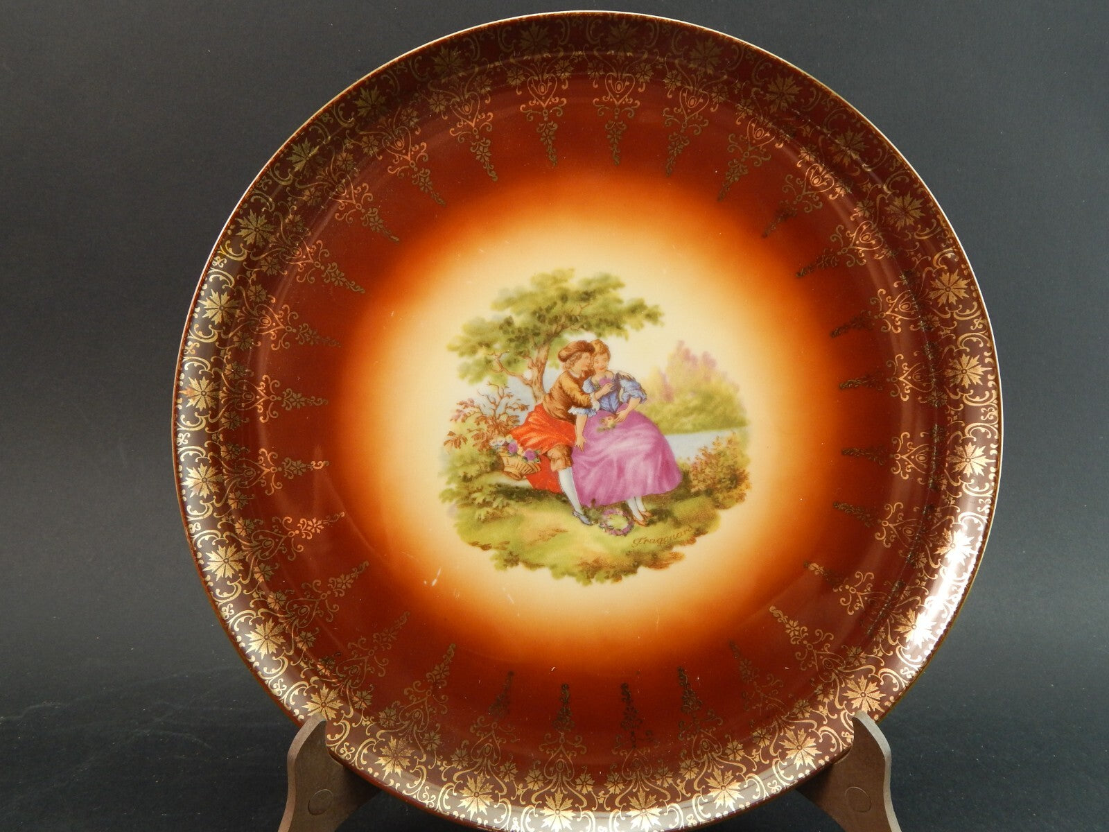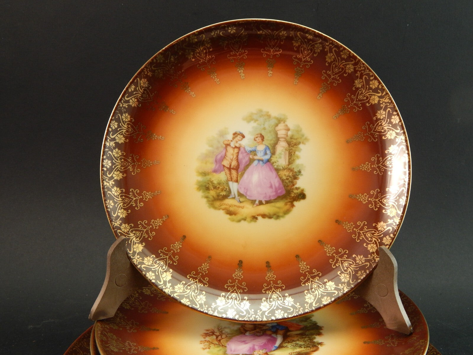 Il servizio composto da un piatto da portata che misura 25,5 cm di diametro, e 6 piatti da dessert che misurano cm 20,5 di diametro è decorato con scene galanti e arabeschi in oro zecchino.
