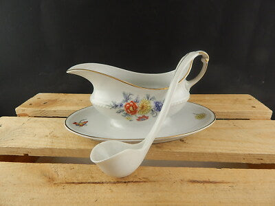Una salsiera che misura 17 x 8 cm, il piatto alla base misura 24 x 14 con cucchiaio in porcellana che misura 19 cm di lunghezza