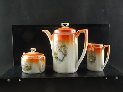 In questa inserzione viene presentato un antico set composto da caffettiera, lattiera, zuccheriera realizzato con decoro a lustro alla fine del 1800, decorato con scena galante