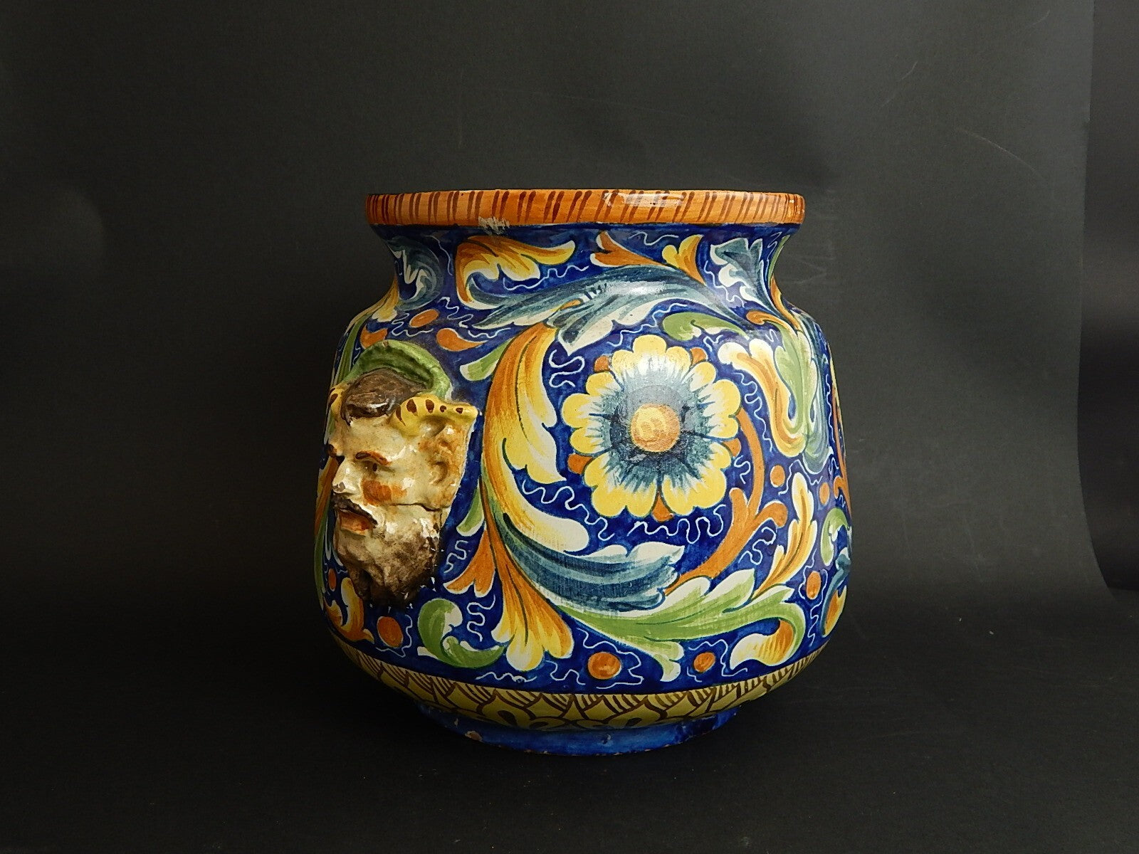 ANTICO VASO CACHE POT FIORIERA CON MASCHERONI CERAMICA CALTAGIRONE PRIMO 900