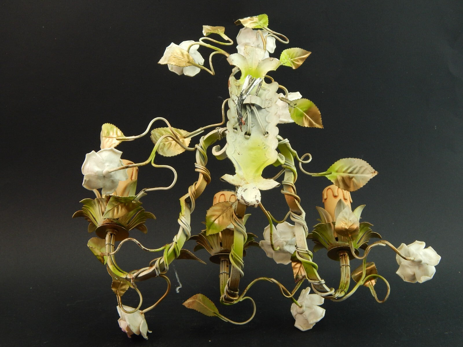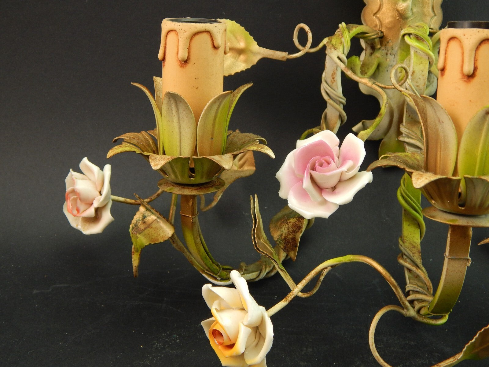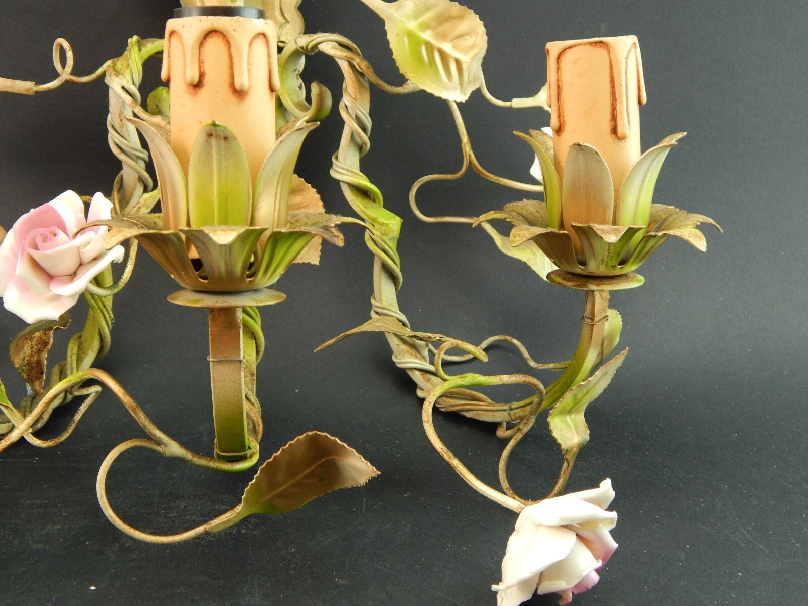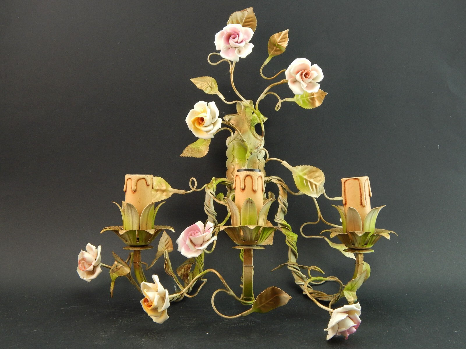 In questa inserzione viene presentato un'antica applique a 3 fuochi in ferro battuto con rose in ceramica policrome