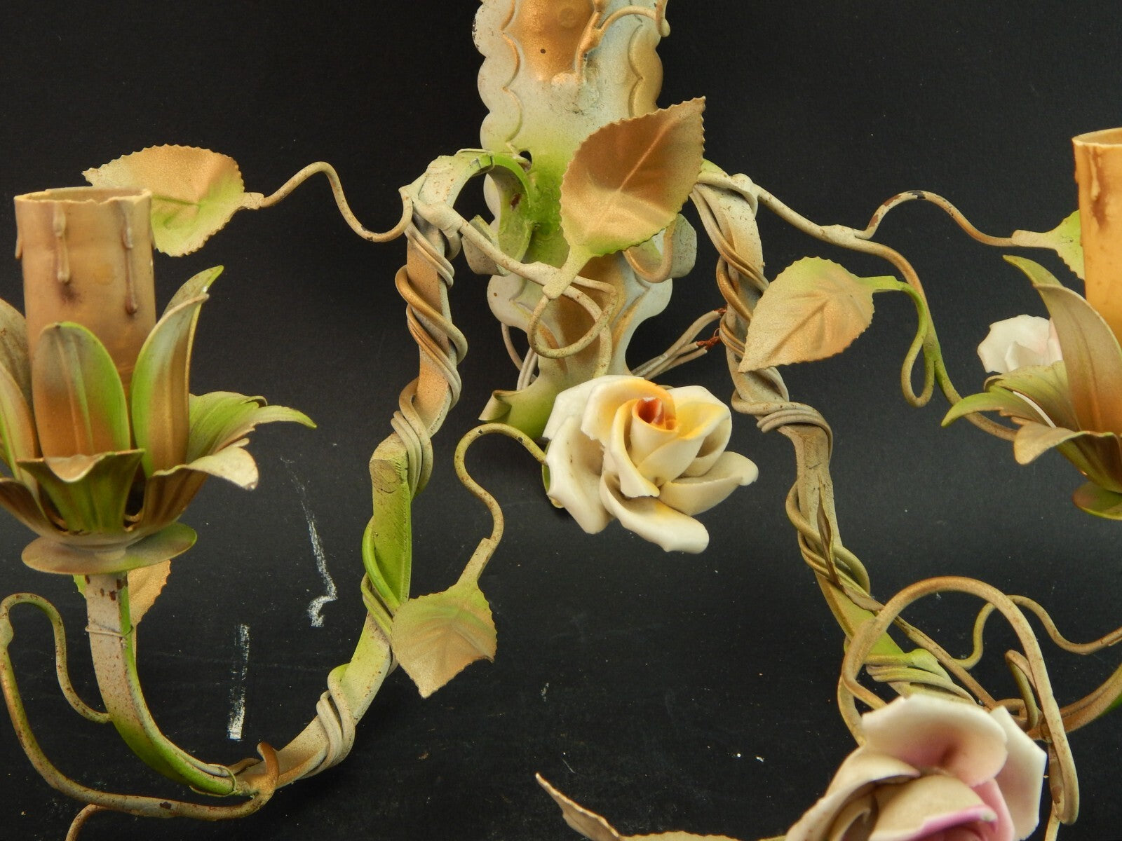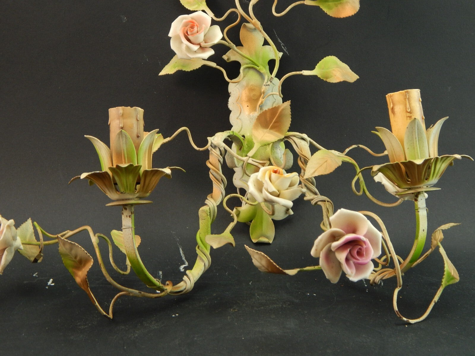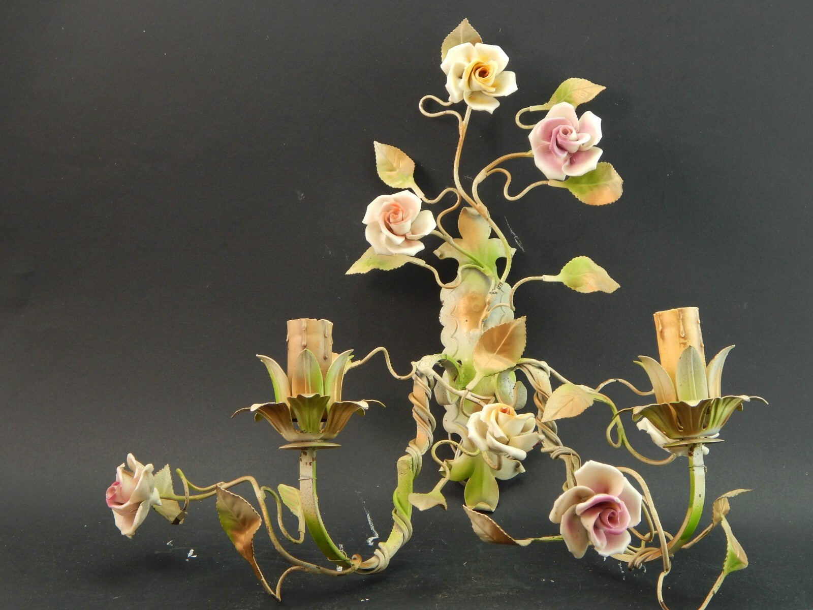 In questa inserzione viene presentato un'antica applique a 3 fuochi in ferro battuto con rose in ceramica policrome