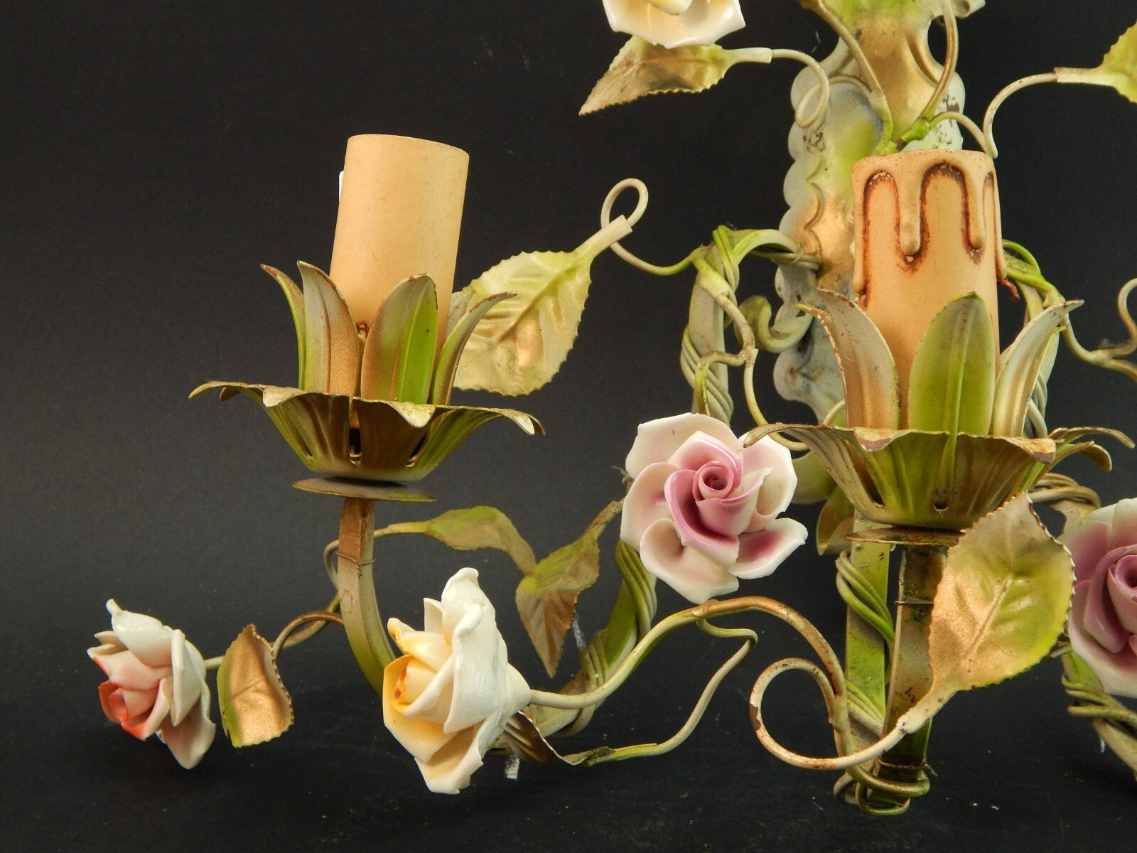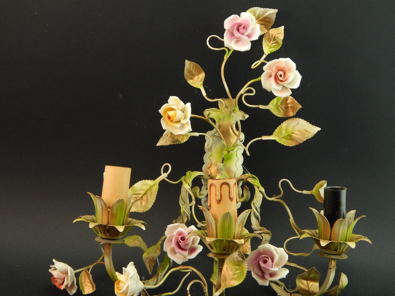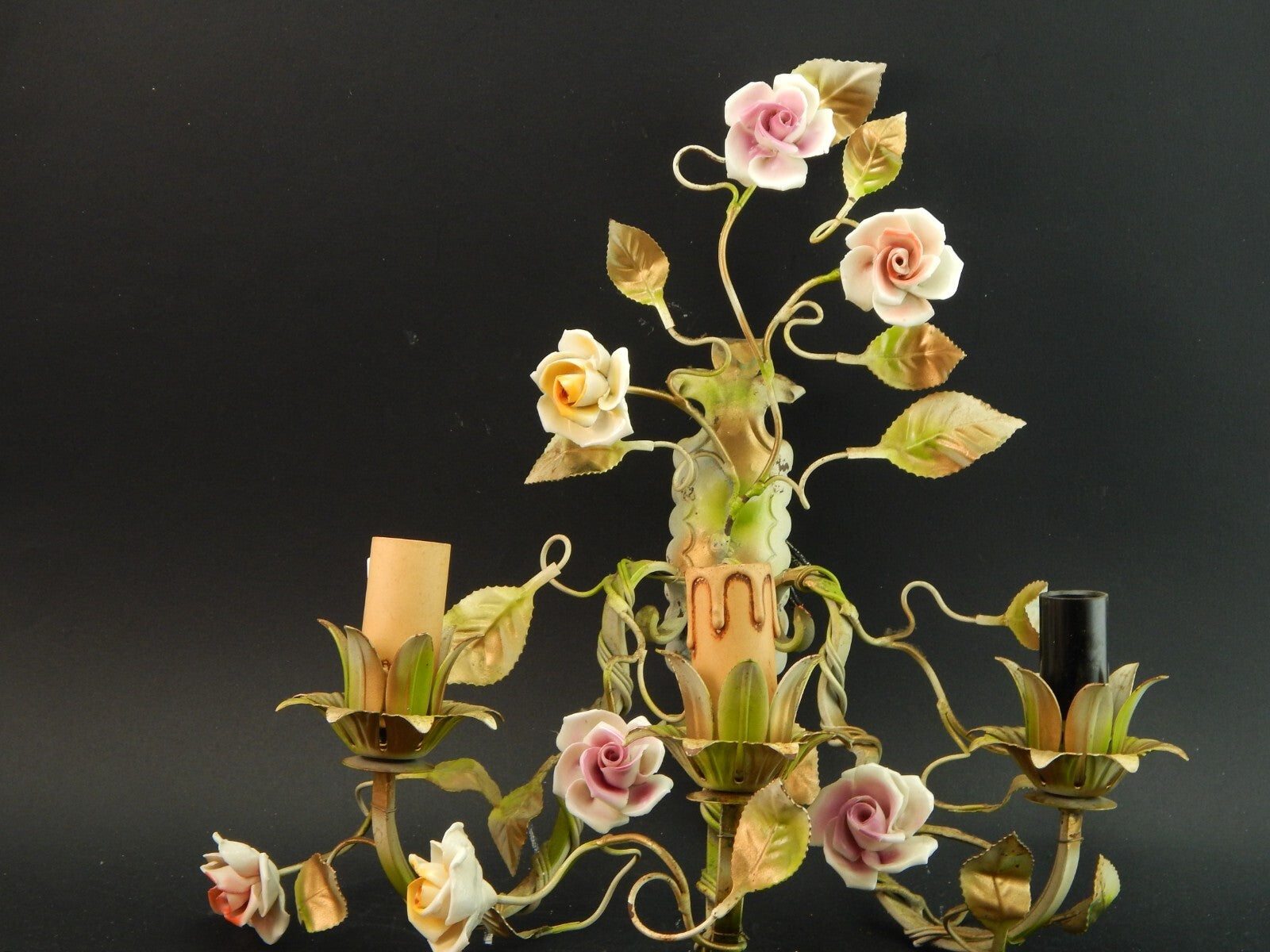 In questa inserzione viene presentato un'antica applique a 3 fuochi in ferro battuto con rose in ceramica policrome