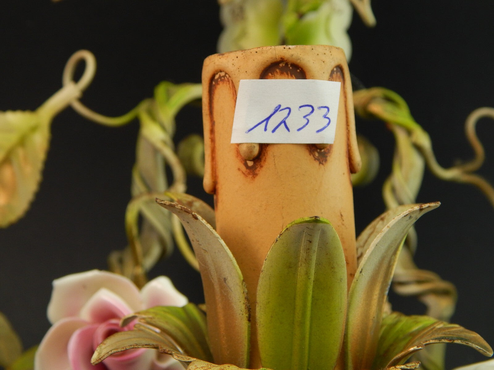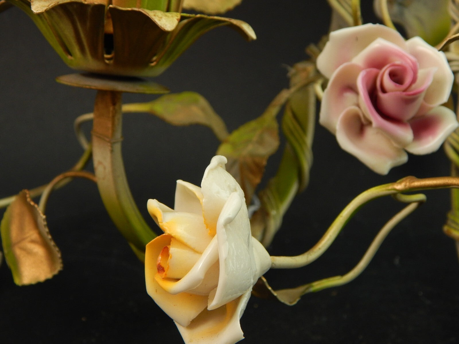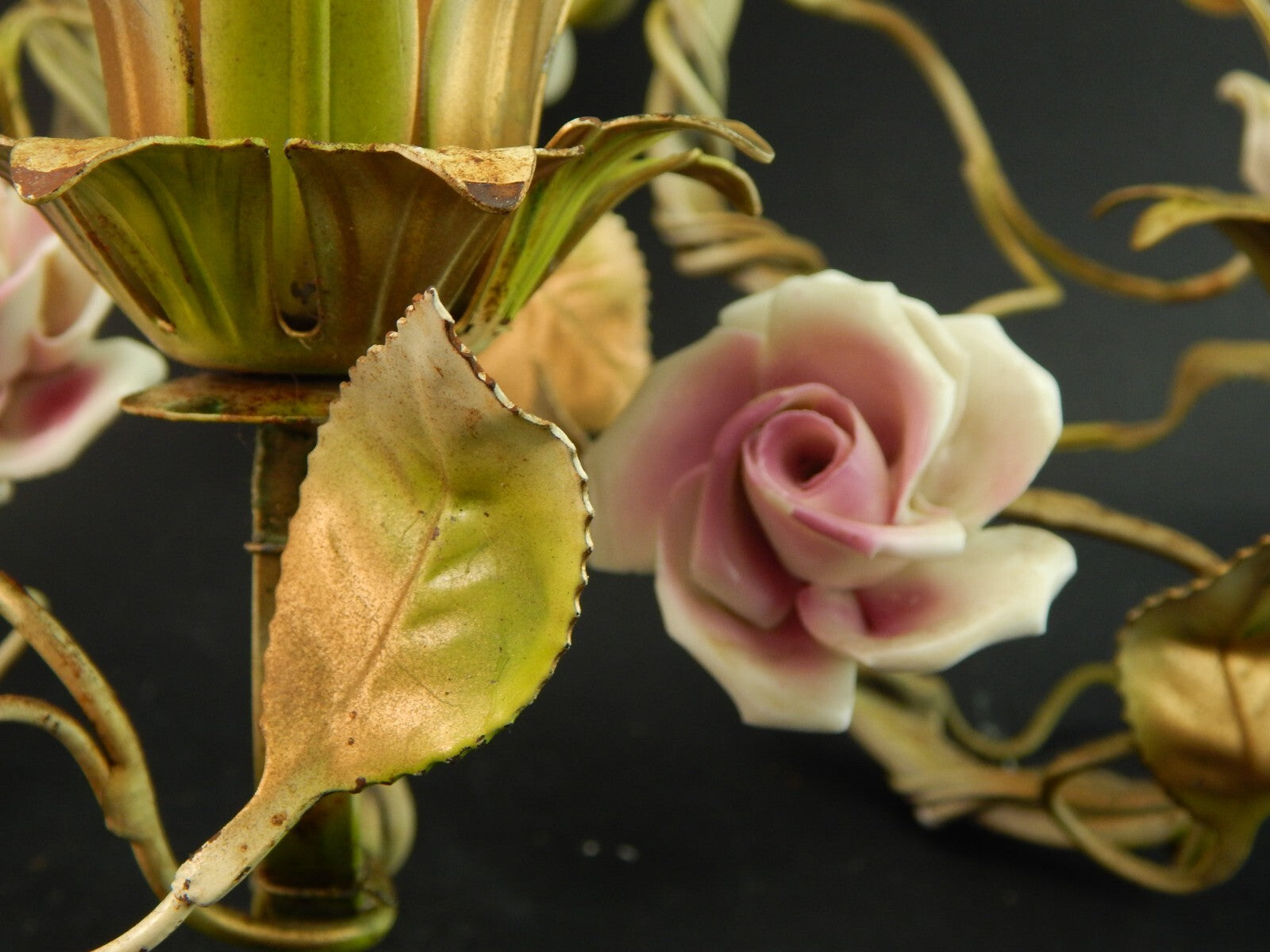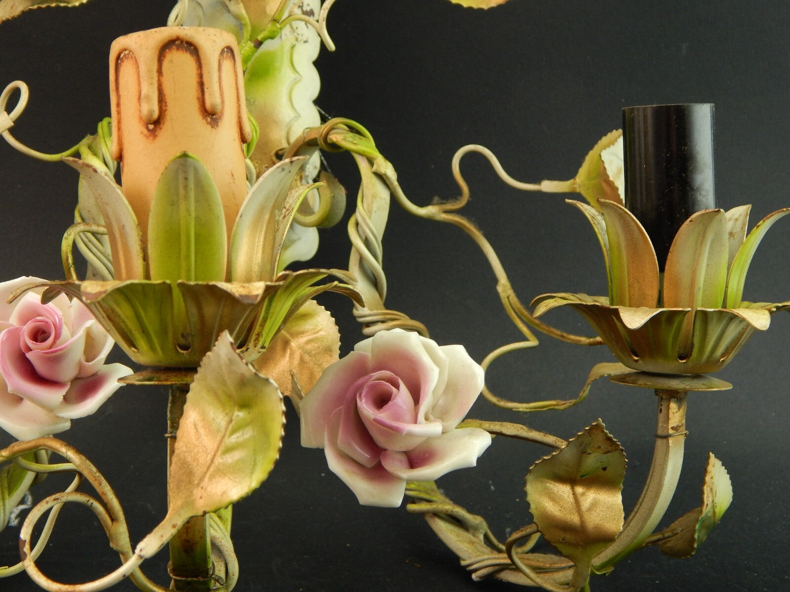 In questa inserzione viene presentato un'antica applique a 3 fuochi in ferro battuto con rose in ceramica policrome