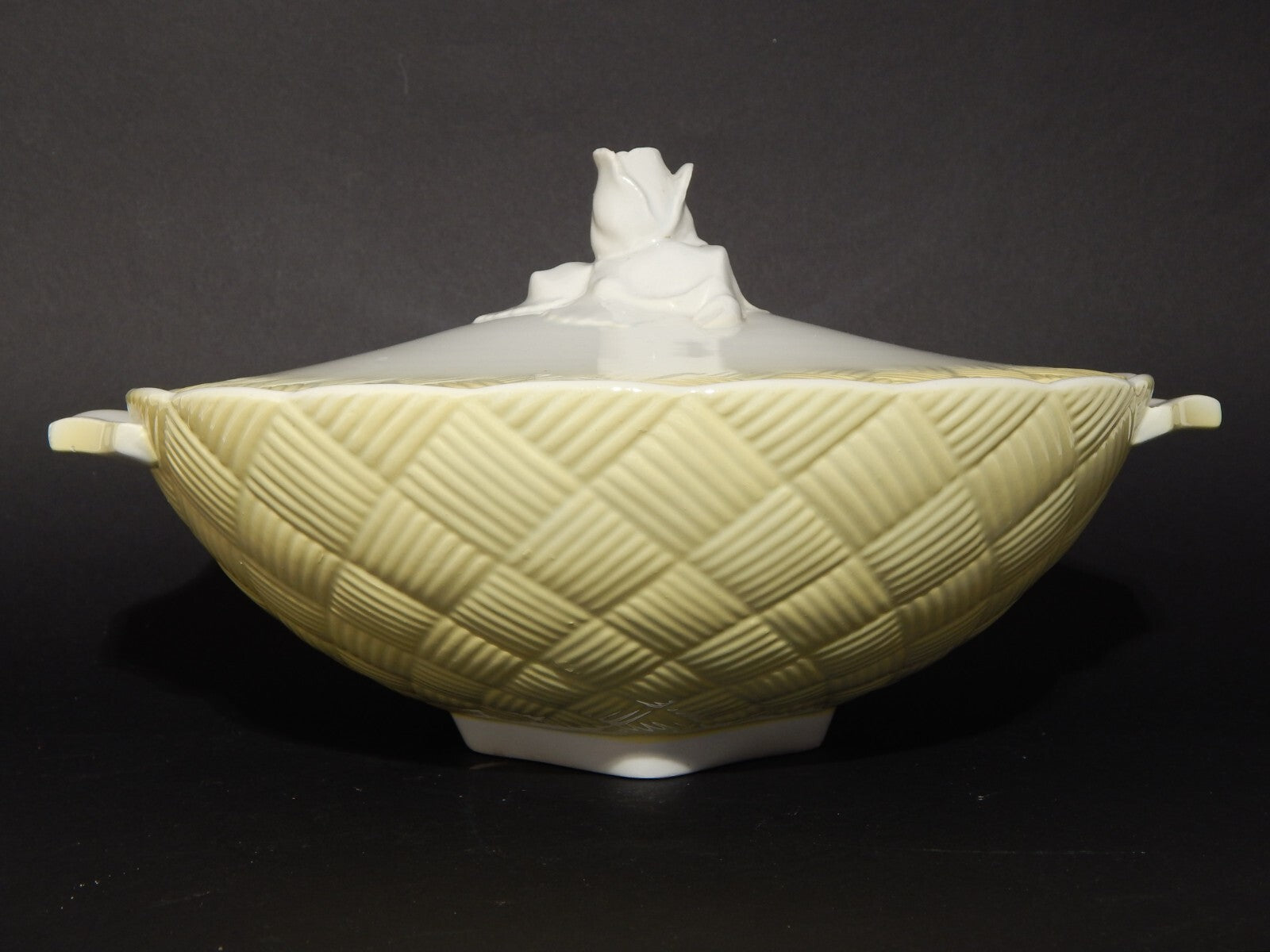 Il centrotavola è stato realizzato negli anni '30 e misura 28 cm di diametro, 32,5 cm da manico a manico e 18 cm di altezza, come si può vedere dalle foto presenta una minima scheggiatura su un manico