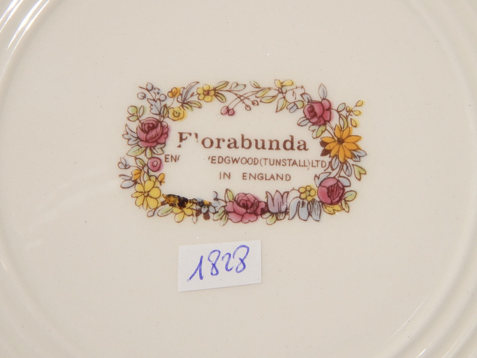 In questa inserzione viene presentato un servizio da tavola composto da 18 piatti di ceramica realizzato dalla manifattura Enoch Wedgwood Tunstall nel famoso disegno Florabunda
