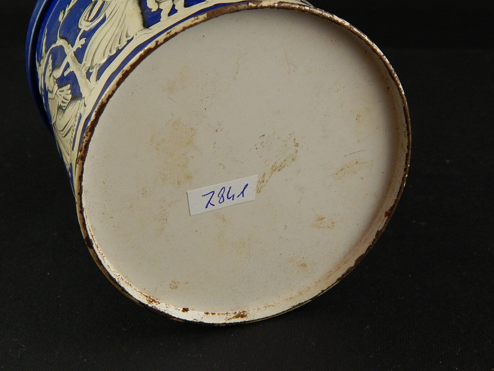 In questa inserzione viene presentata una scatola di latta da collezione blu cobalto con figure della mitologia classica