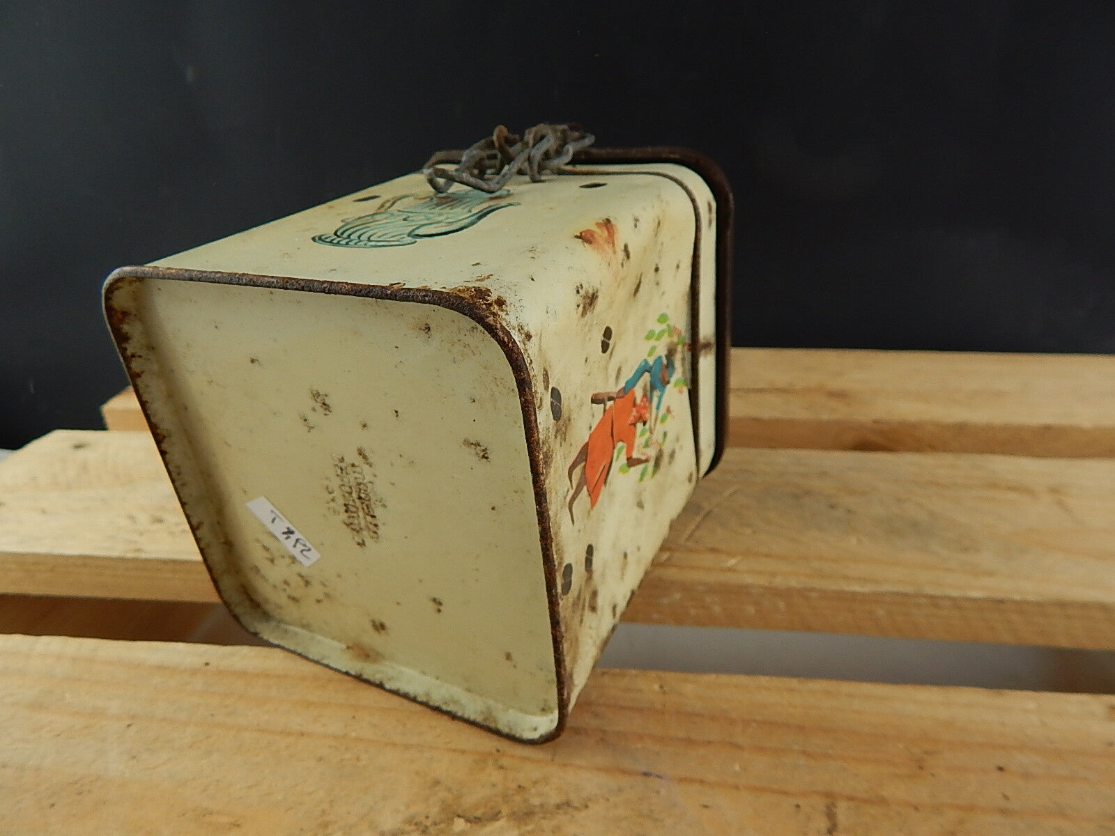 La scatola di latta misura 10 cm. di lato e 12,5 cm di altezza. Per le condizioni vedere le foto