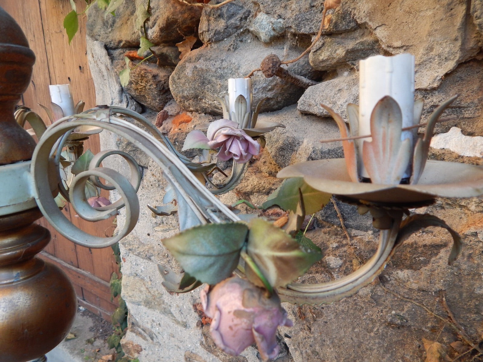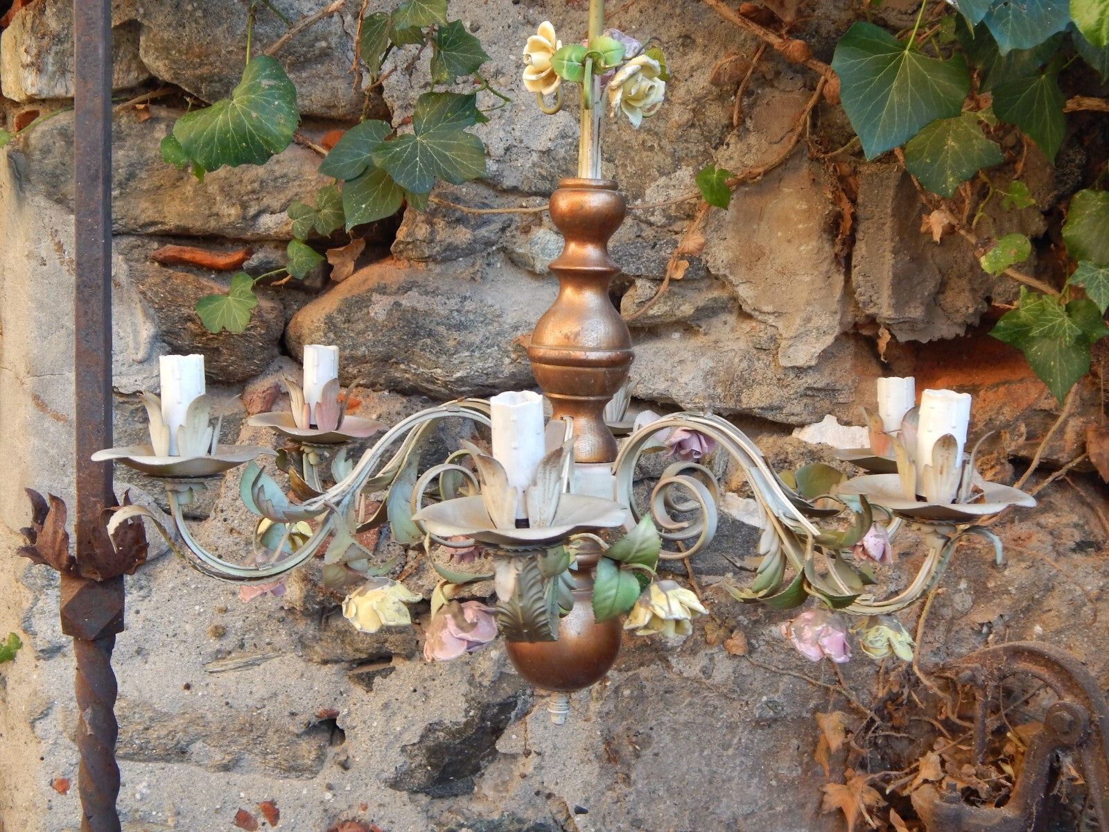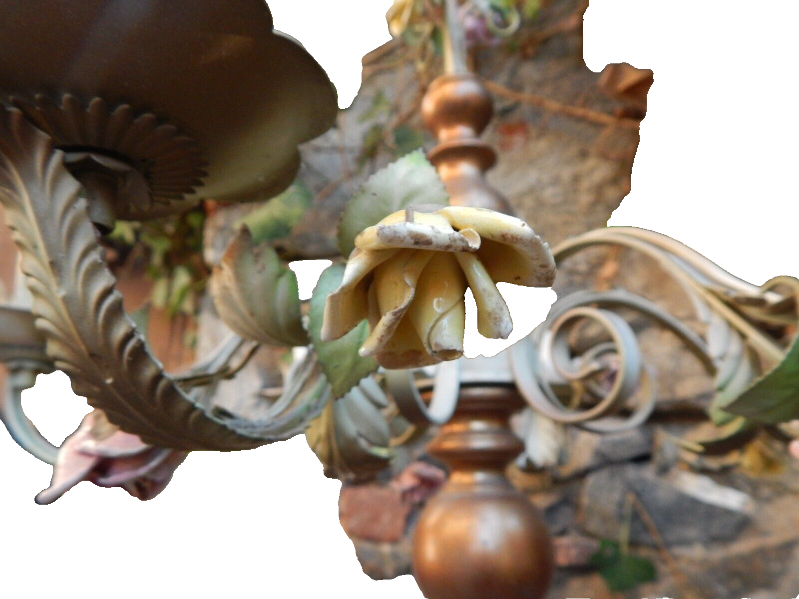 In questa inserzione viene presentato un antico lampadario a 6 fuochi con foglie in ferro battuto e rose in ceramica (una è mancante)