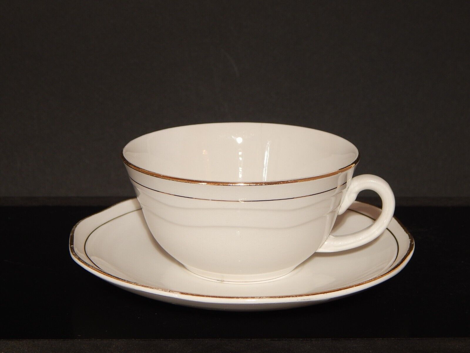 La tazza in ceramica bianca e profili oro misura 10 cm di diametro e 5 cm di altezza e il piattino misura 14,5 cm di diametro, come si può vedere dalle foto la tazza presenta una leggera filatura