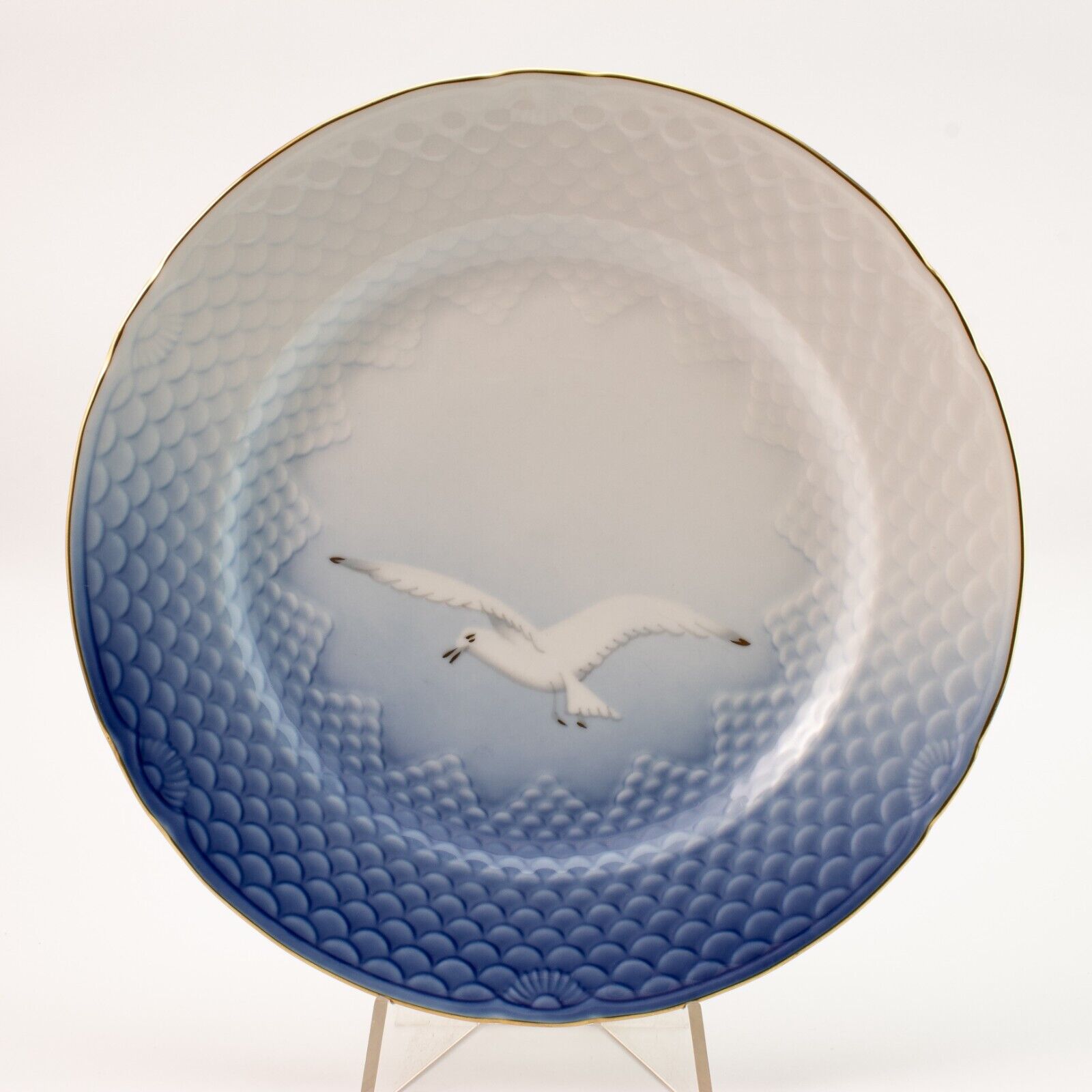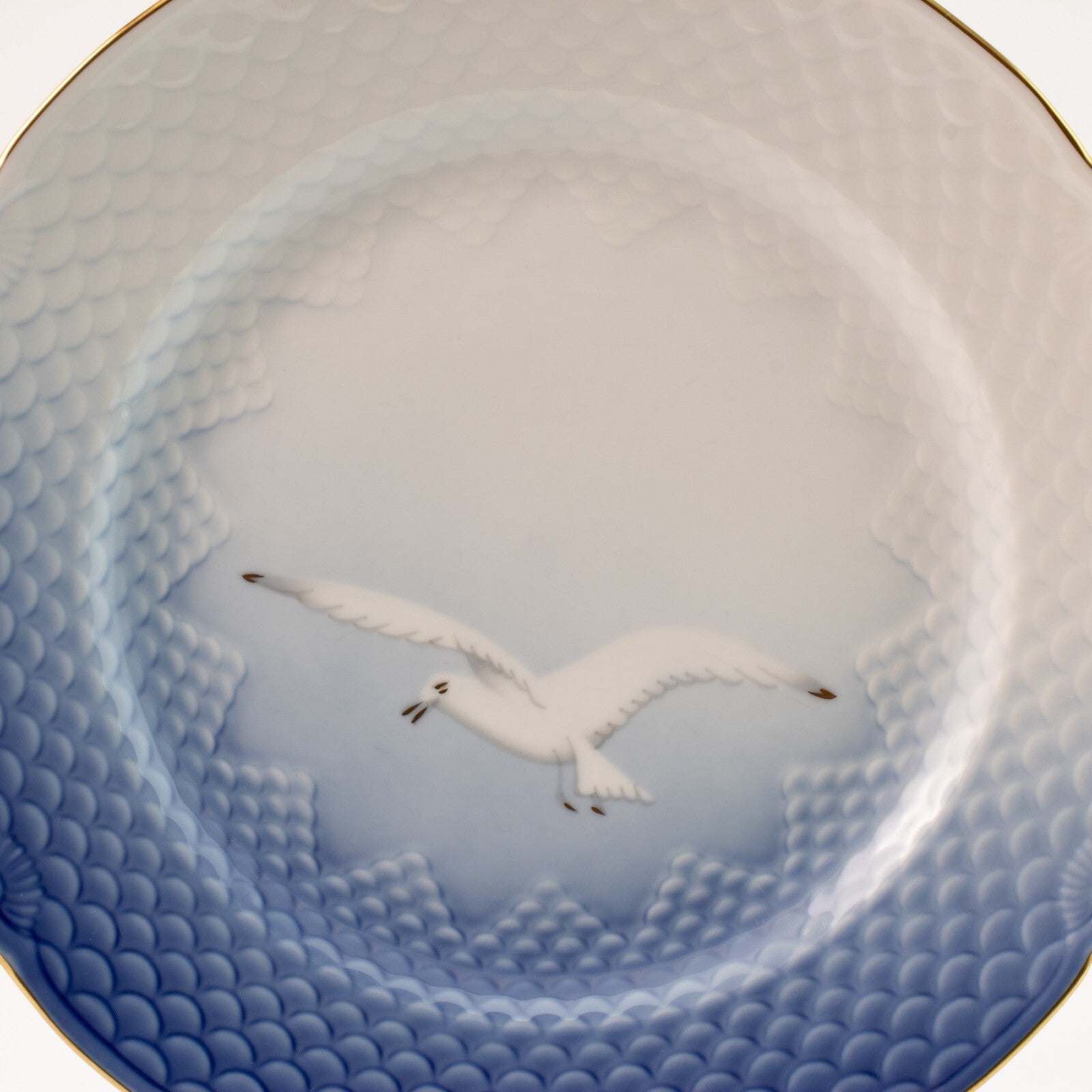 Piatto piano della famosa serie “SEAGULL - GABBIANI” prodotta dalla manifattura Danese Bing&Grondahl. Il piatto è stato realizzato in finissima porcellana con finiture in oro zecchino e il motivo ornamentale è in rilievo, decorato a mano nelle classiche sfumature azzurre applicate sottosmalto.