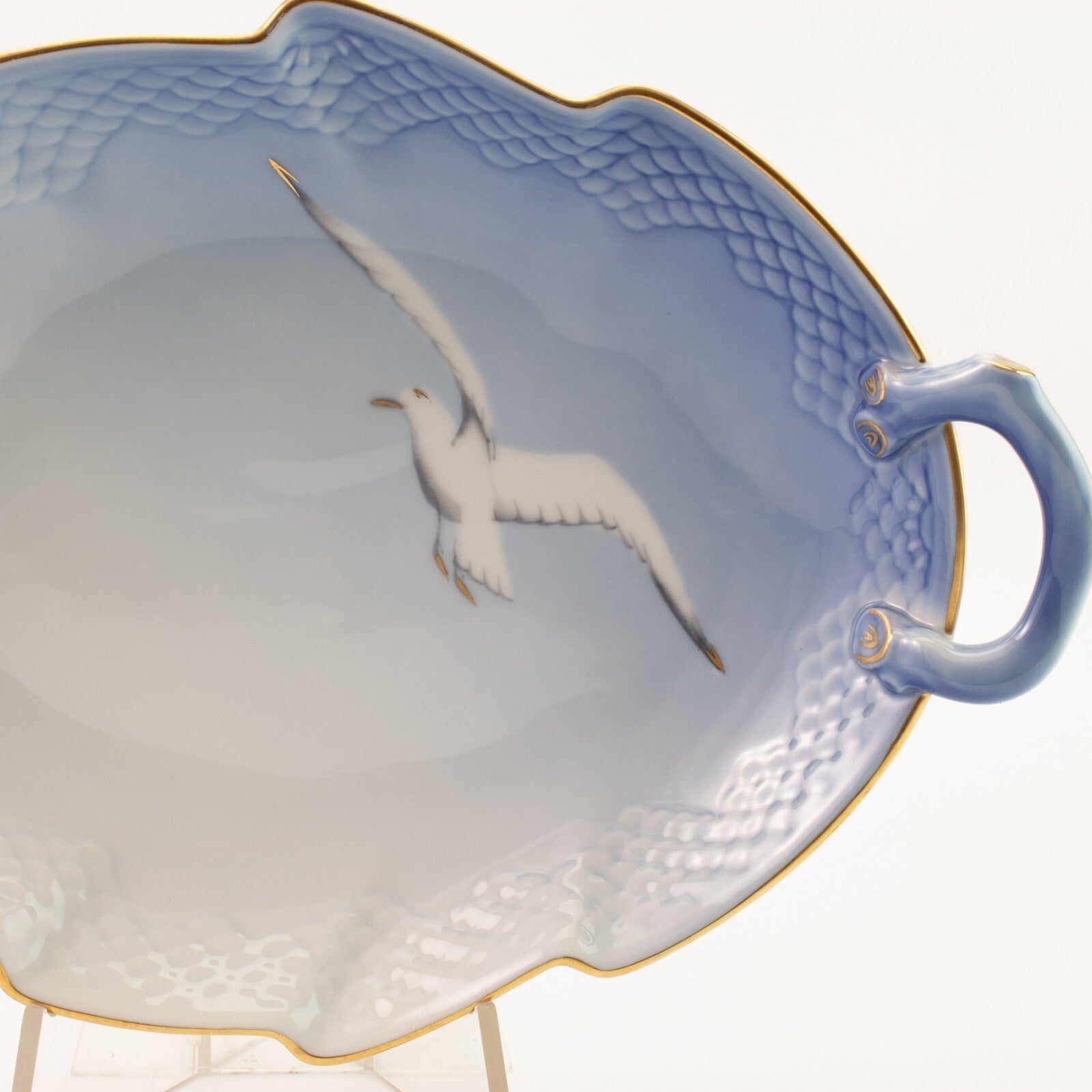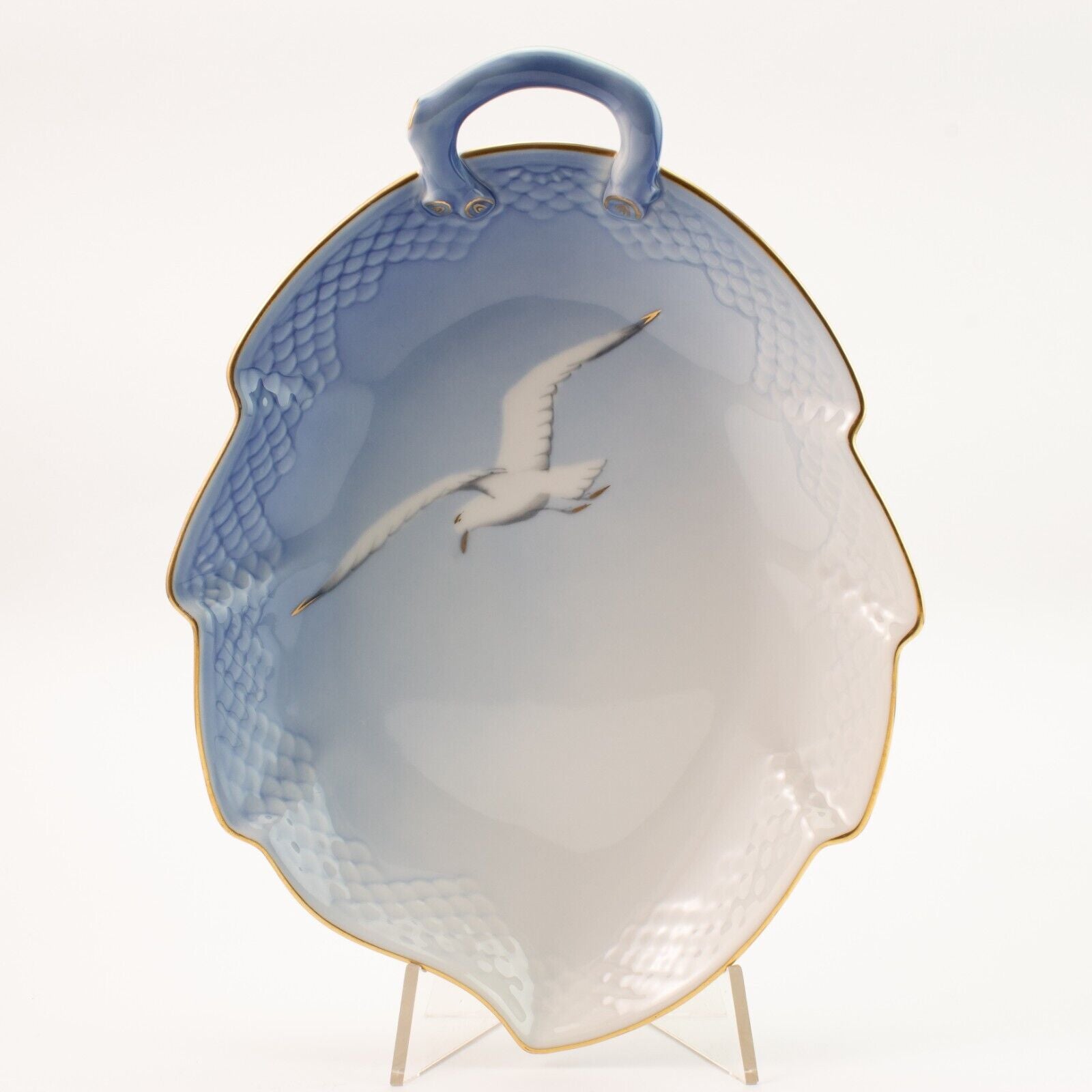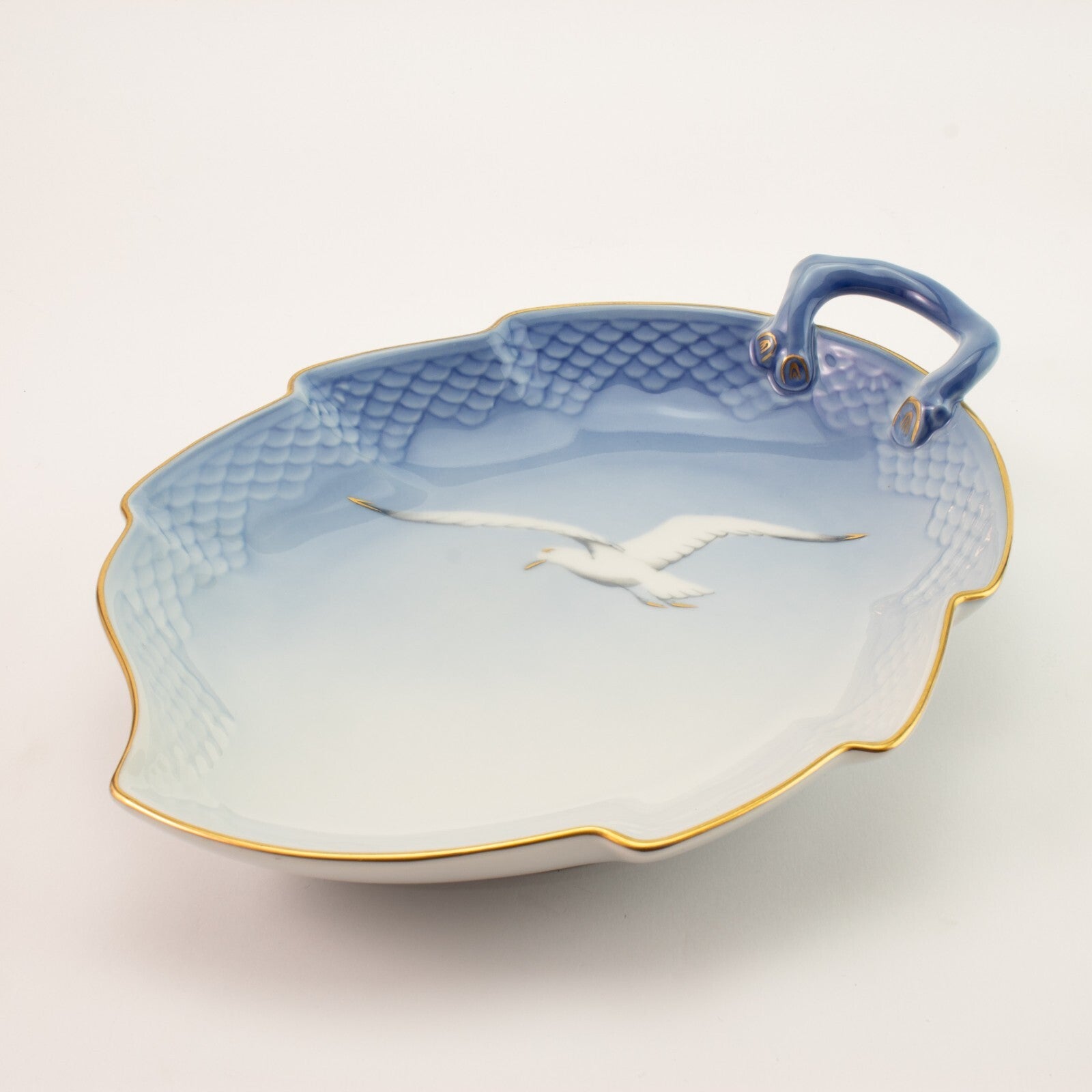 Piatto da portata a foglia della famosa serie “SEAGULL - GABBIANI” prodotta dalla manifattura Danese Bing&Grondahl. Il piatto è stato realizzato in finissima porcellana con finiture in oro zecchino e il motivo ornamentale è in rilievo, decorato a mano nelle classiche sfumature azzurre applicate sottosmalto.
