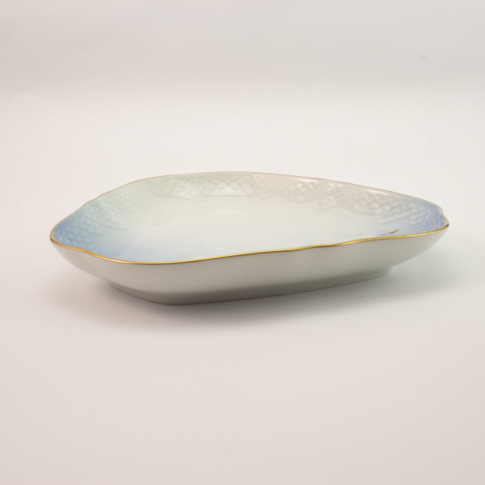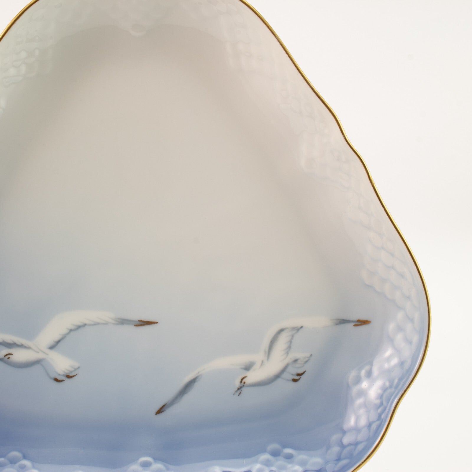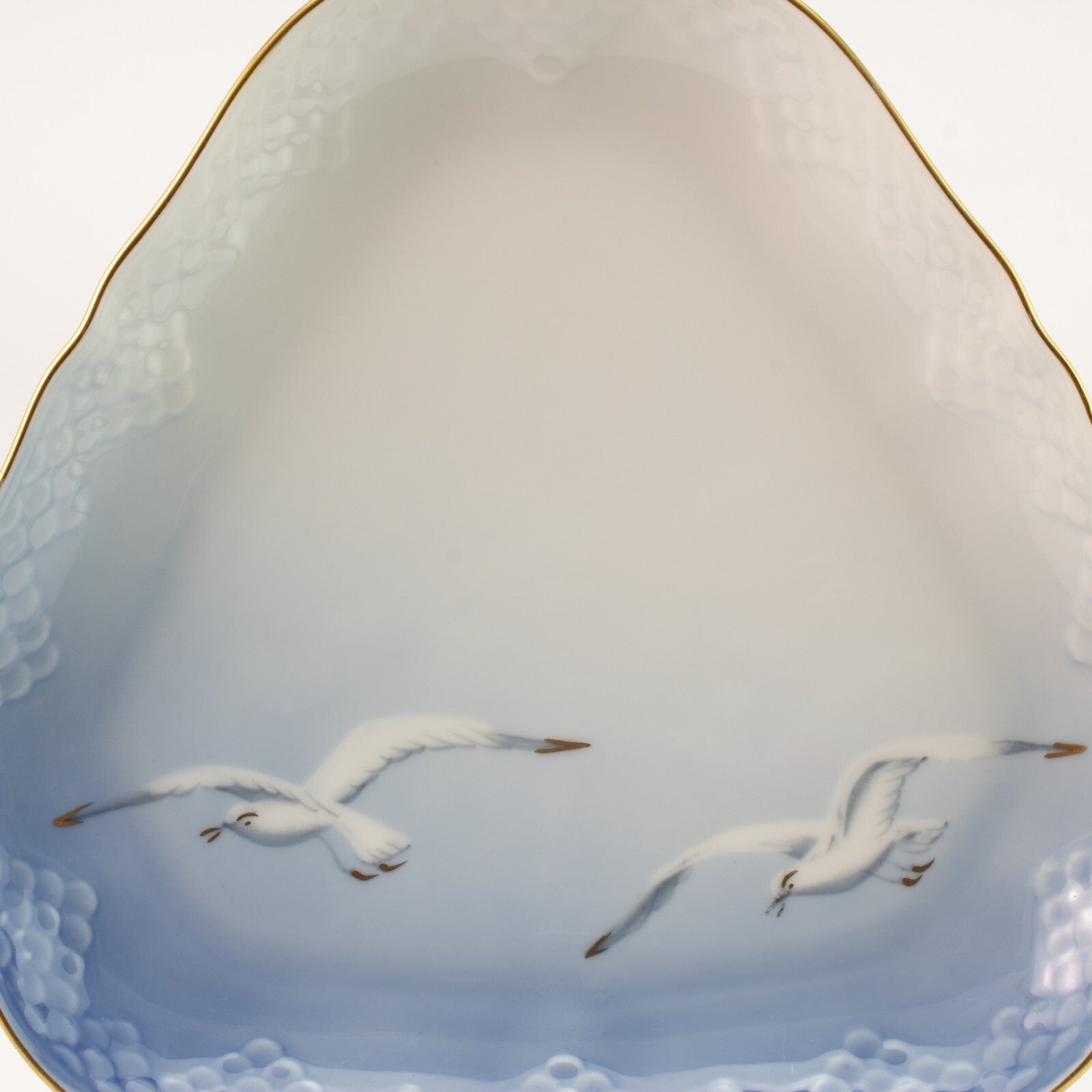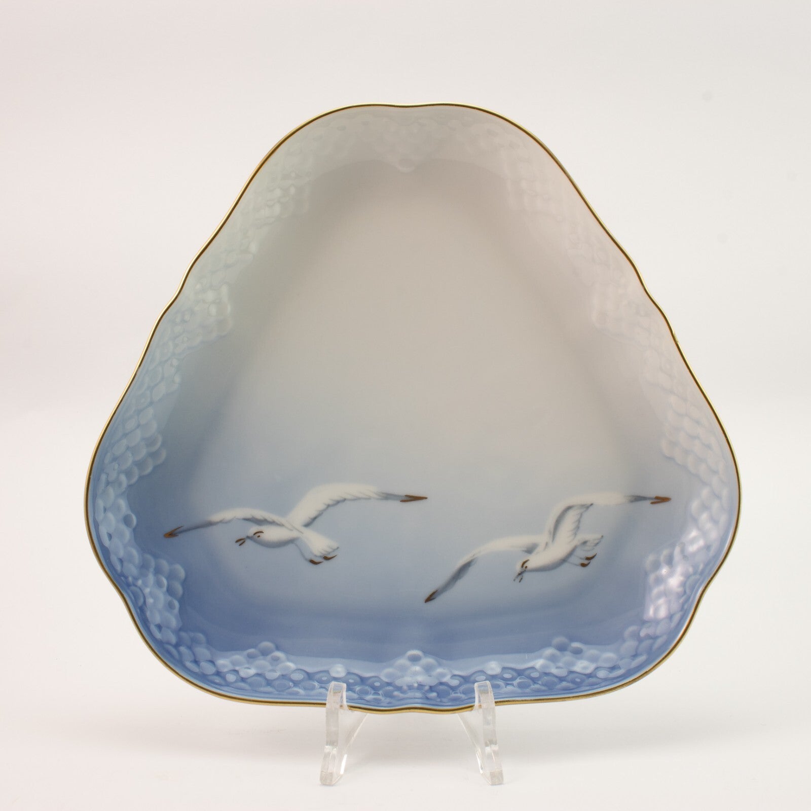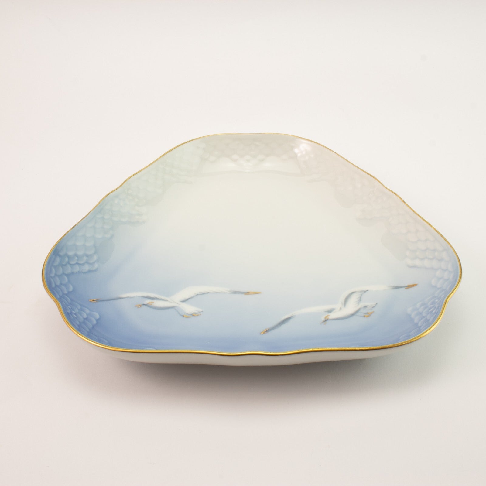 Piatto da portata triangolare della famosa serie “SEAGULL - GABBIANI” prodotta dalla manifattura Danese Bing&Grondahl. Il piatto è stato realizzato in finissima porcellana con finiture in oro zecchino e il motivo ornamentale è in rilievo, decorato a mano nelle classiche sfumature azzurre applicate sottosmalto.