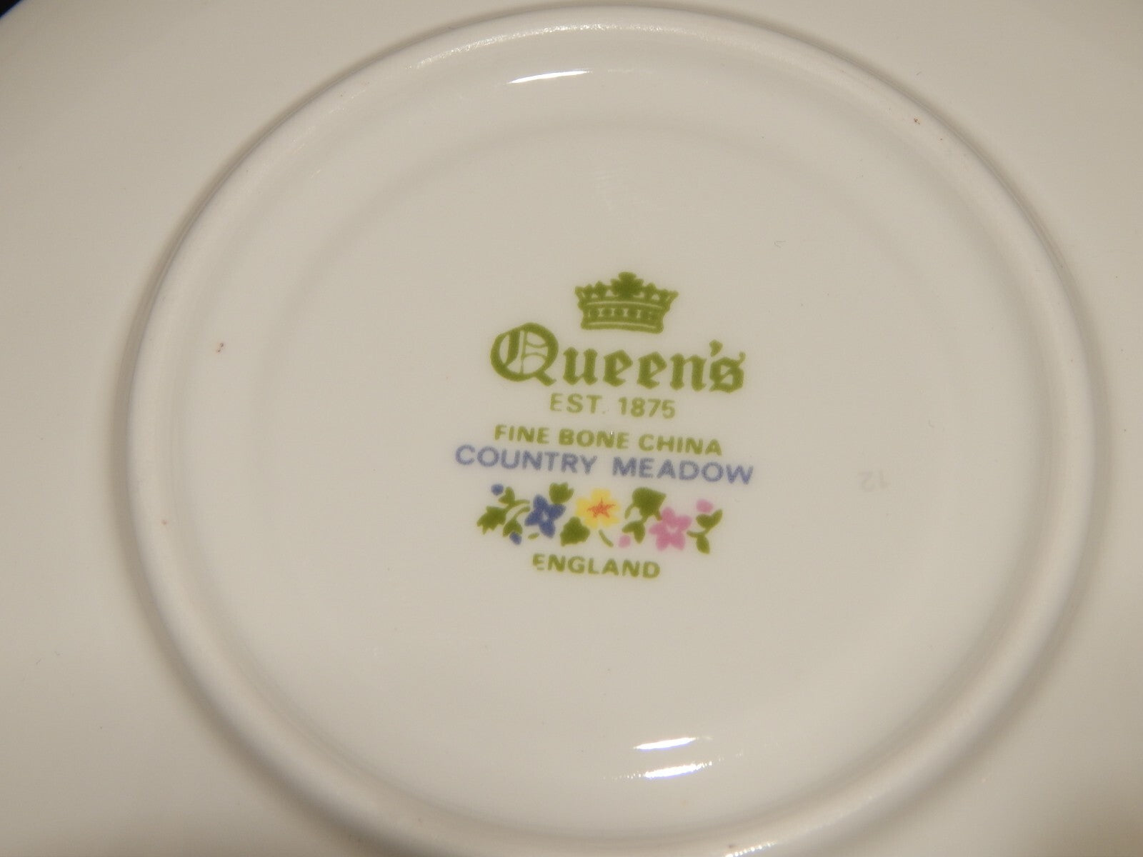In questa inserzione viene presentata una tazza con relativo piattino realizzata dalla manifattura inglese Queen's Bone China nel disegno Country Meadows