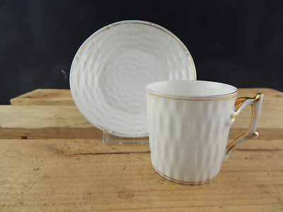La tazzina lavorata in rilievo a modo di paniere di vimini e rifinita in oro zecchino misura 5,5 cm. di diametro e 6 cm. di altezza, il piattino 13 cm. di diametro.