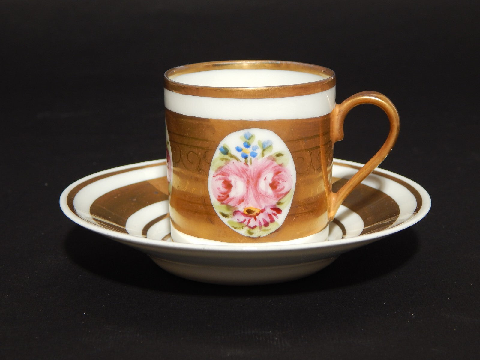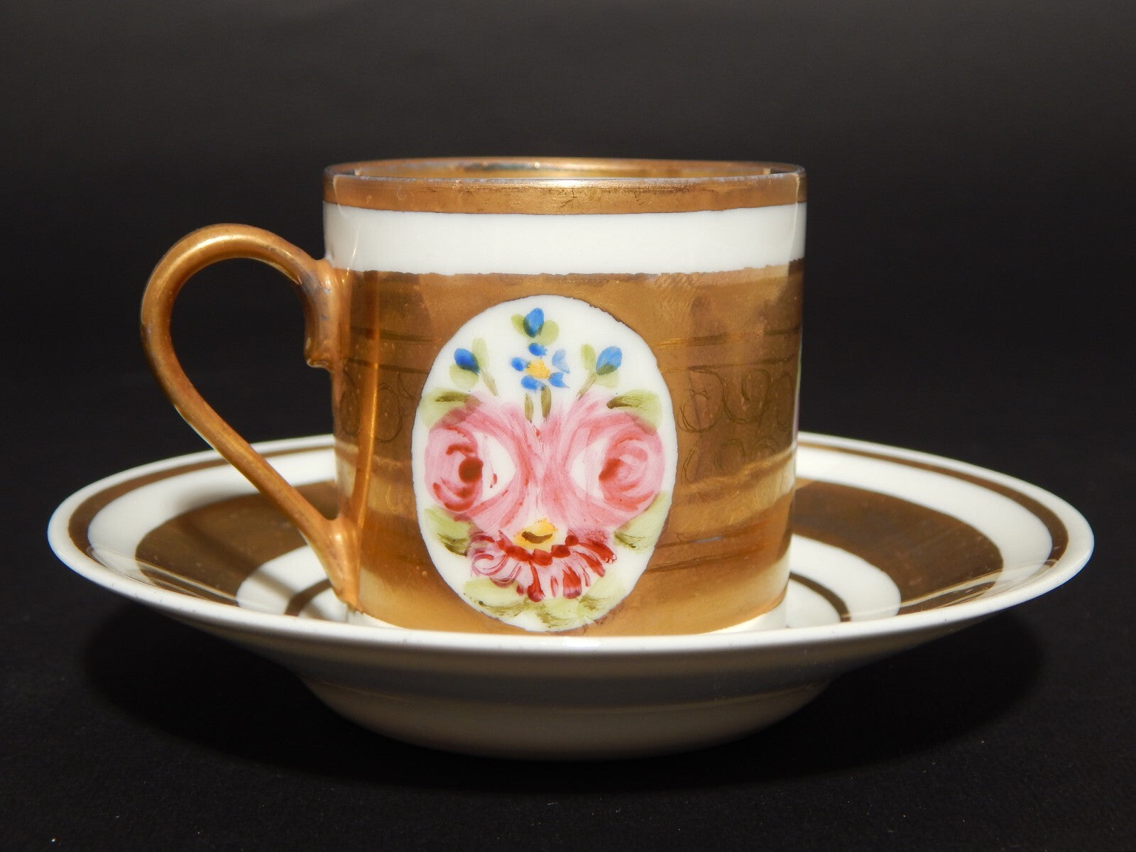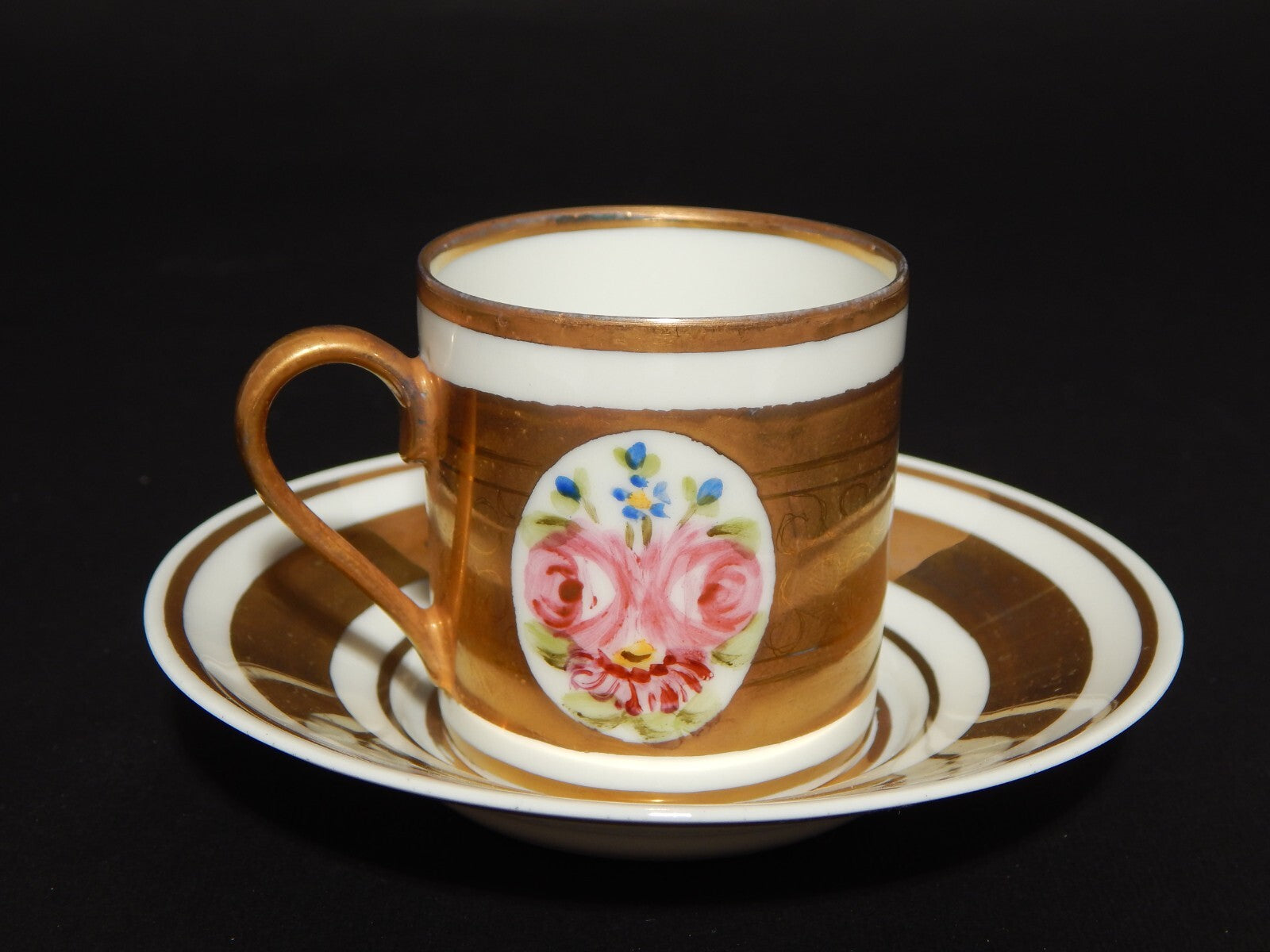 La tazzina dipinta a mano con disegno floreale e oro zecchino misura 5 cm. di diametro e 5 cm. di altezza, il piattino 11 cm. di diametro.