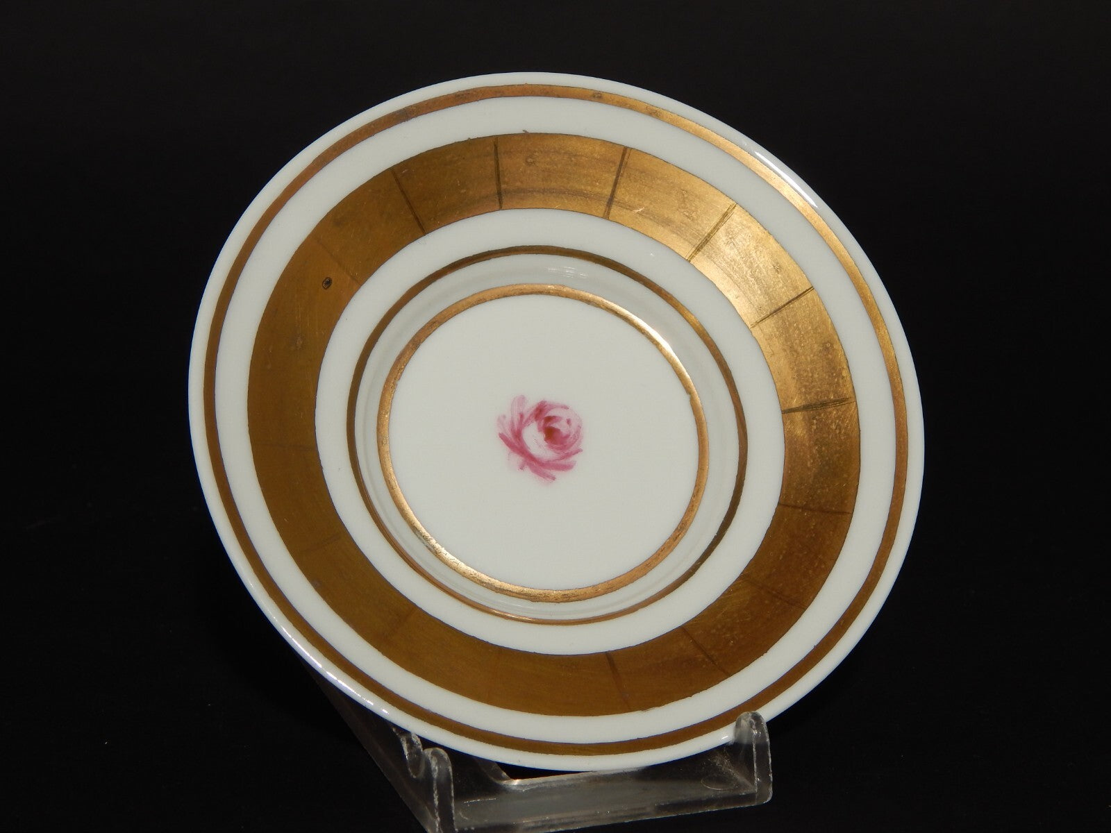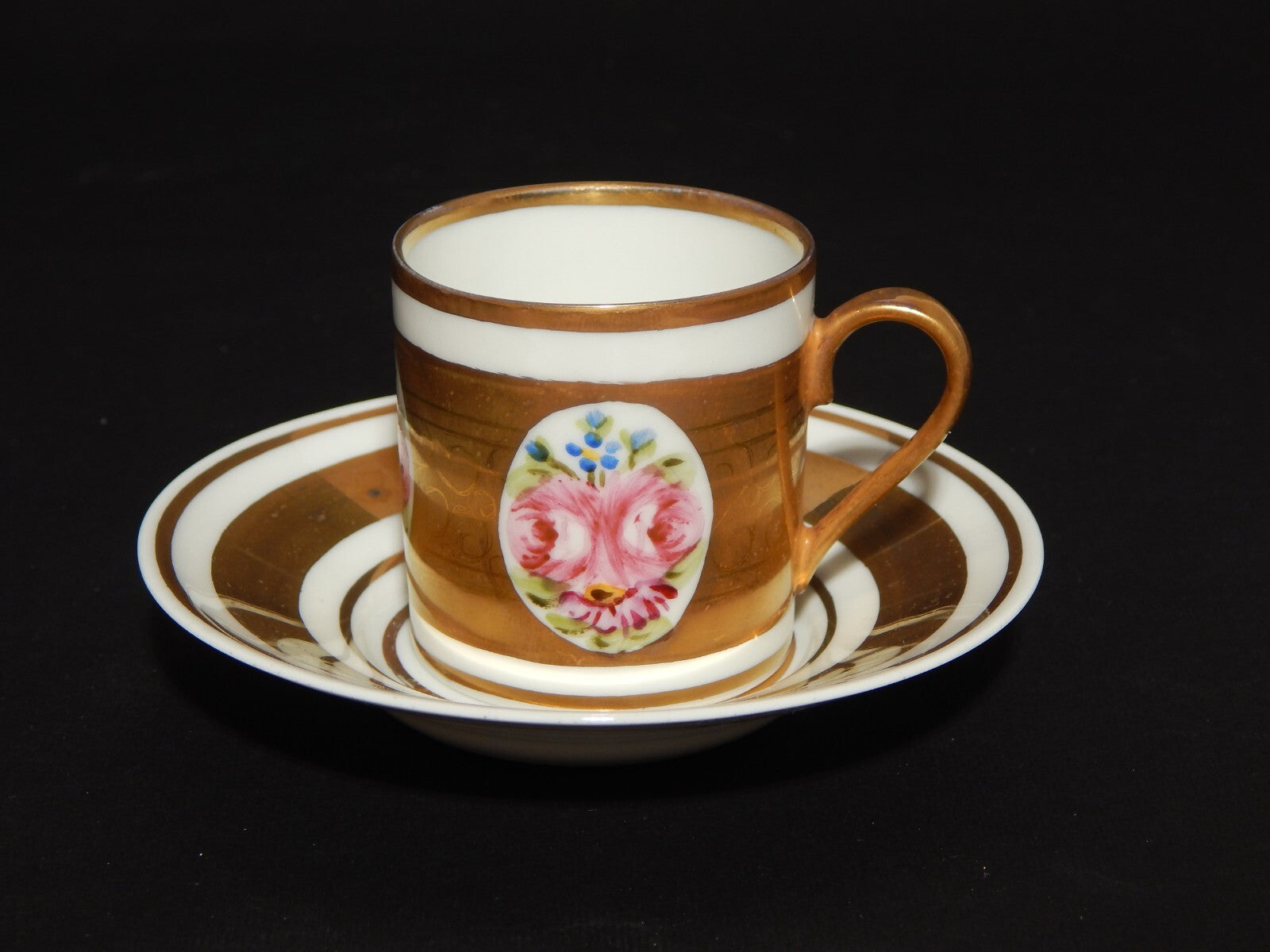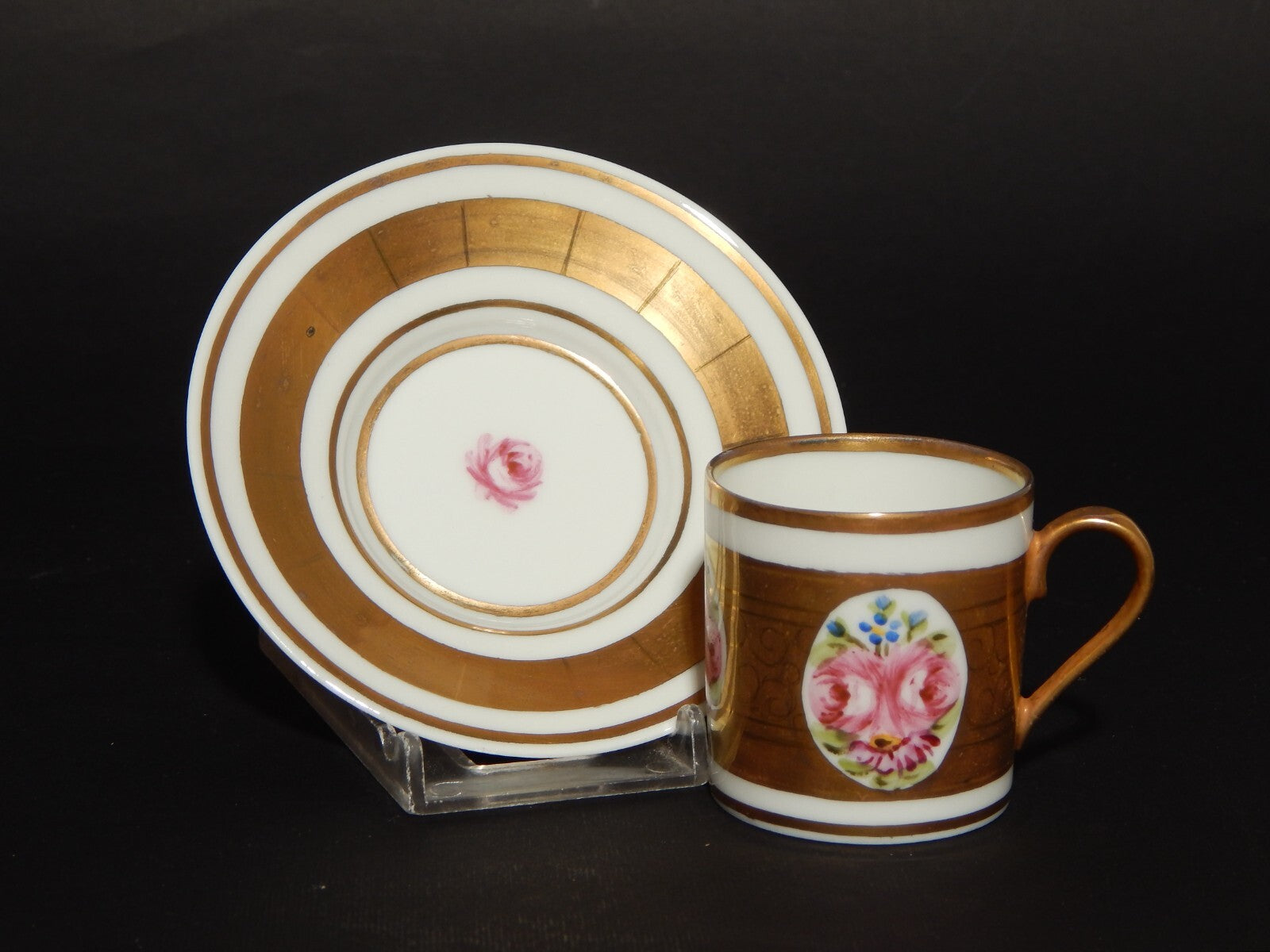 La tazzina dipinta a mano con disegno floreale e oro zecchino misura 5 cm. di diametro e 5 cm. di altezza, il piattino 11 cm. di diametro.