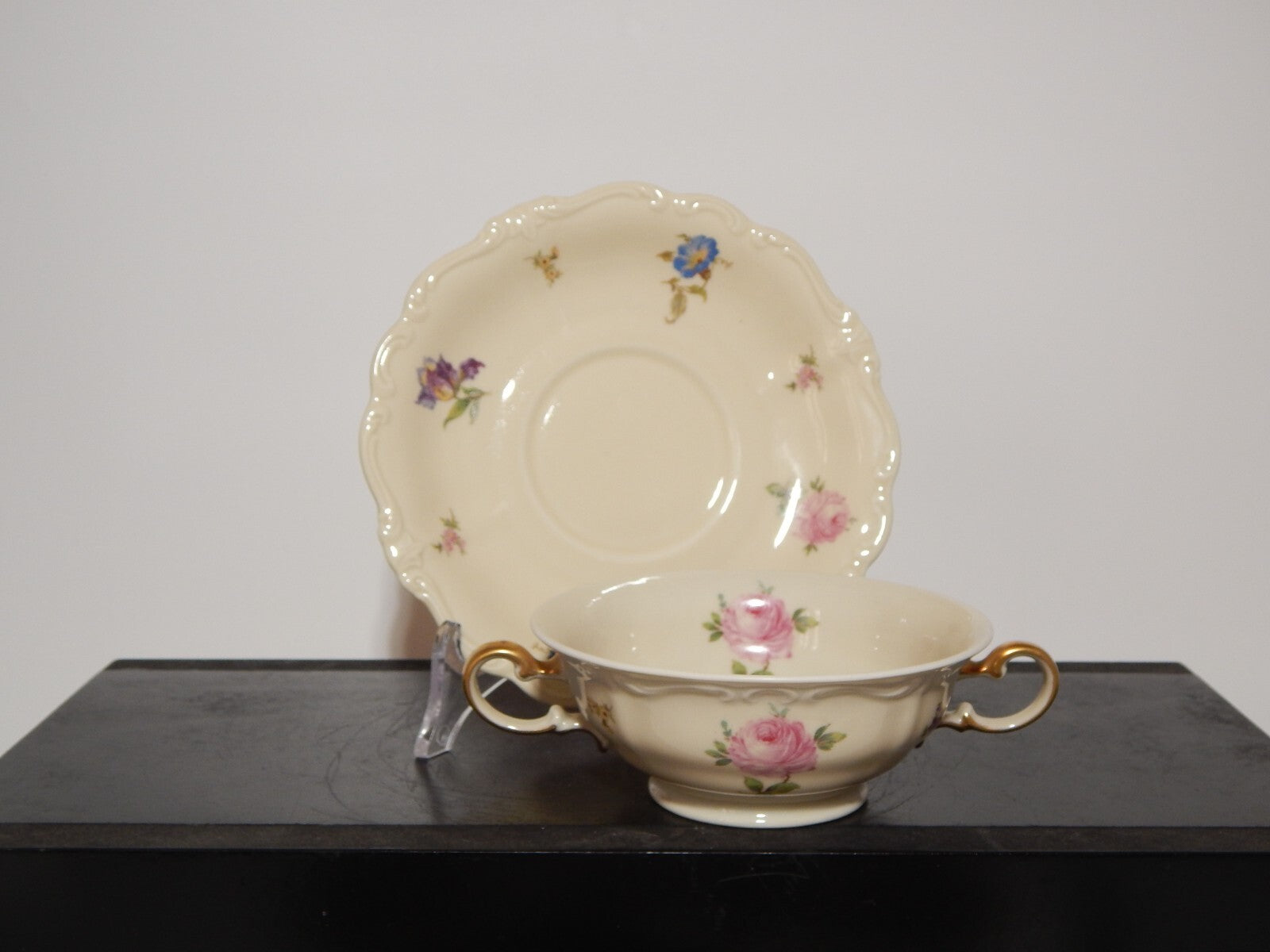 In questa inserzione viene presentata una tazza da brodo con relativo piattino in porcellana color avorio modellati a rocaille e decorati con fiori policromi, realizzati dalla manifattura tedesca Rosenthal nel modello Pompadour