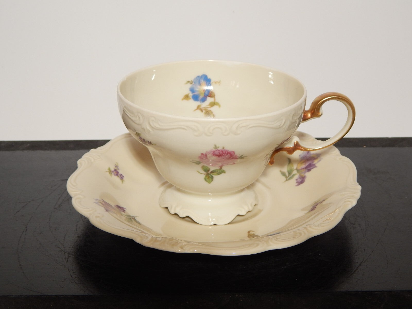 In questa inserzione viene presentata una tazza da tè con relativo piattino in porcellana color avorio modellati a rocaille e decorati con fiori policromi, realizzati dalla manifattura tedesca Rosenthal nel modello Pompadour