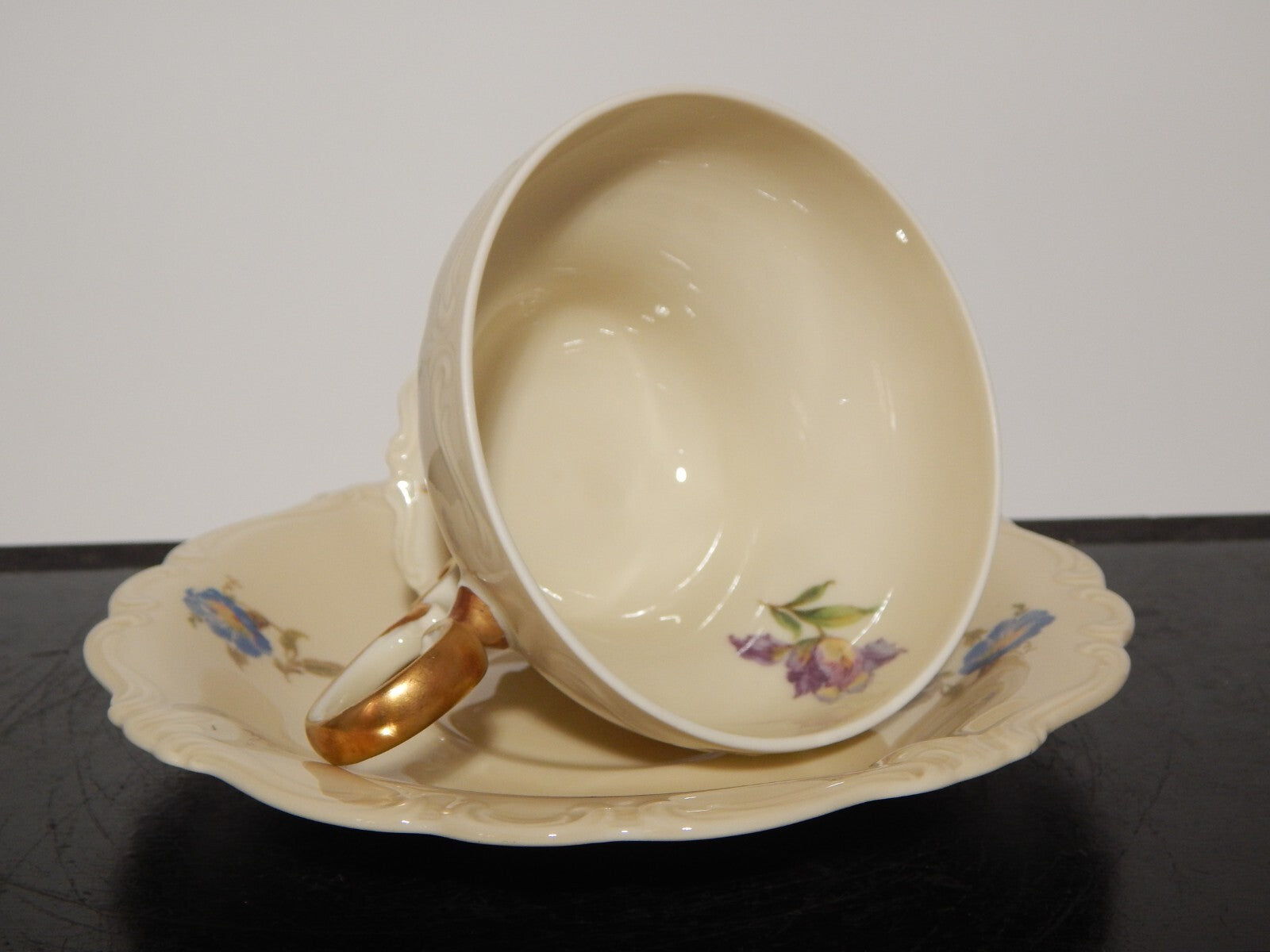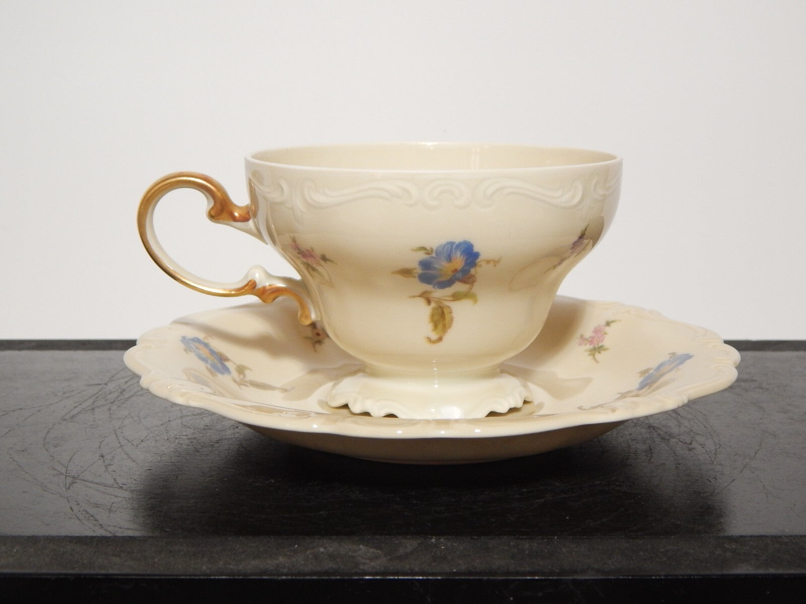 In questa inserzione viene presentata una tazza da tè con relativo piattino in porcellana color avorio modellati a rocaille e decorati con fiori policromi, realizzati dalla manifattura tedesca Rosenthal nel modello Pompadour