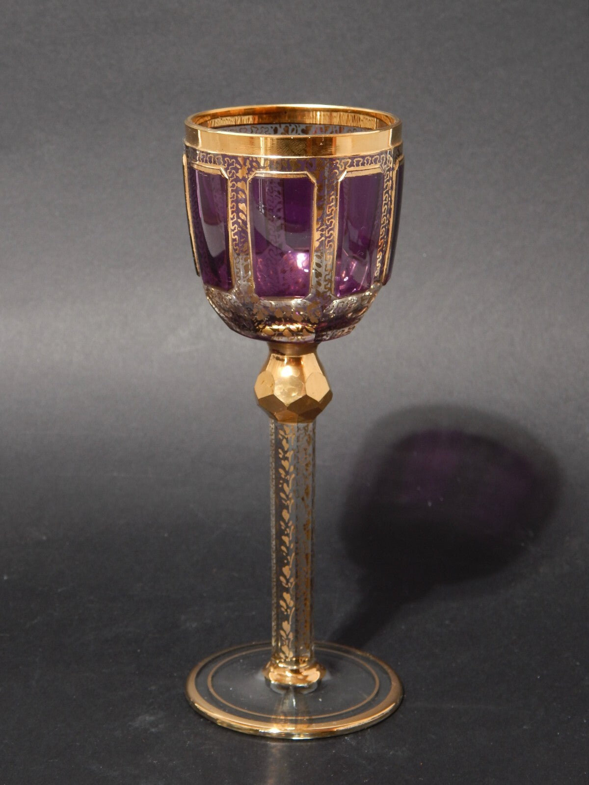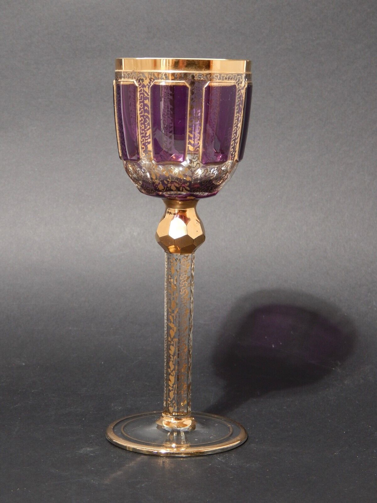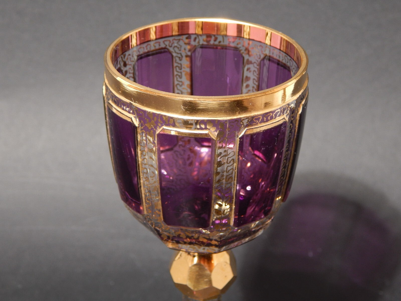 In questa inserzione viene presentato un prezioso bicchiere a calice di cristallo pesante con pannelli color ametista che poggia su uno stelo lungo di cristallo molato e decorato a mano in oro zecchino che poggia su una base rotonda con doppio bordo decorato in oro.