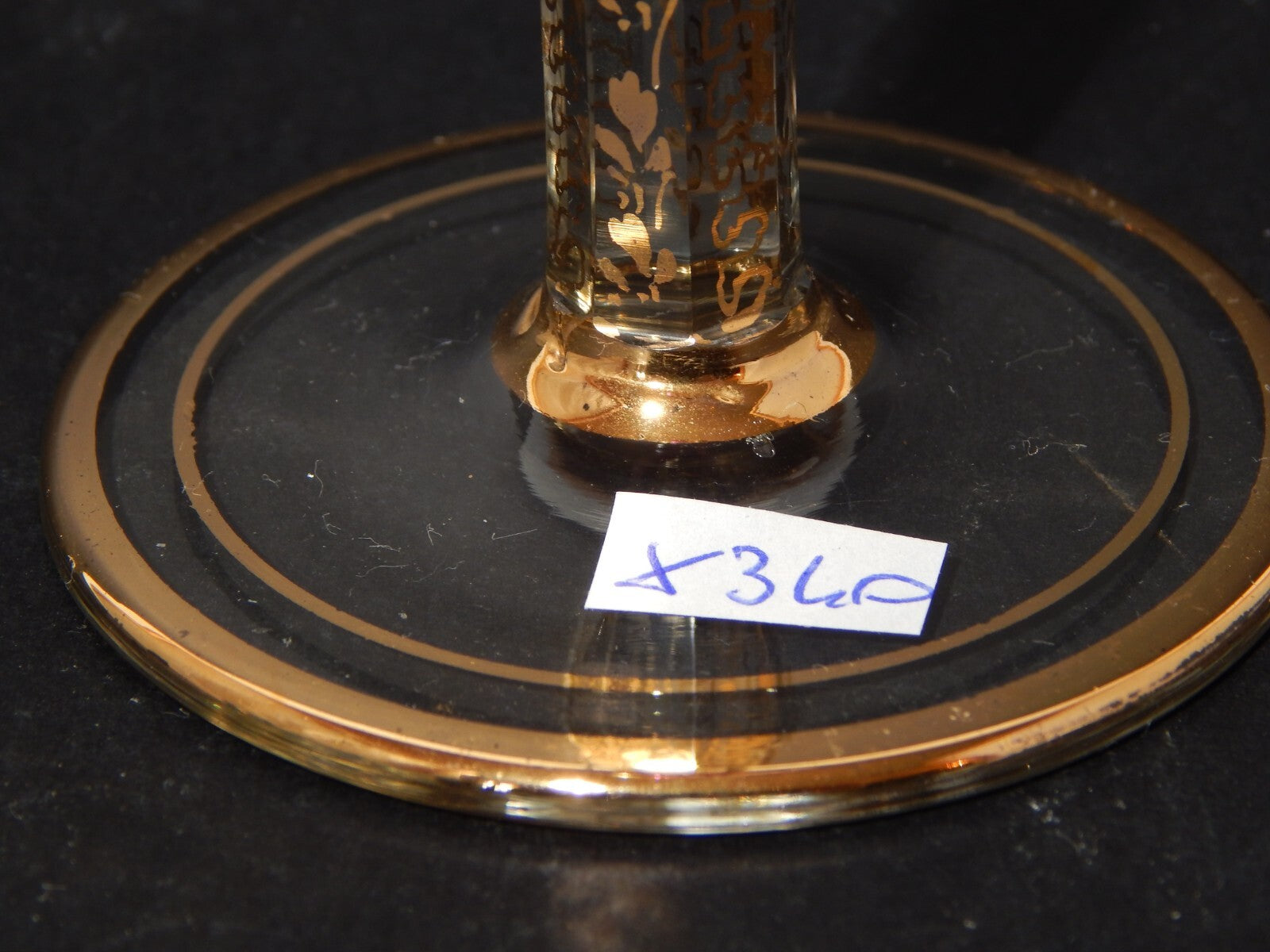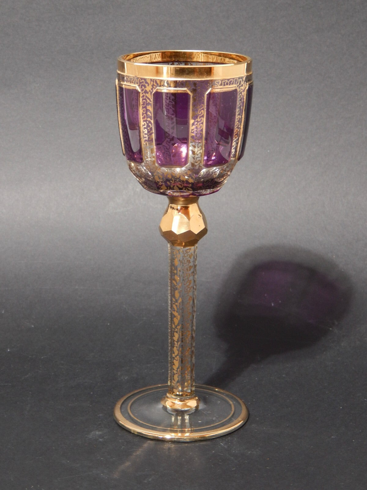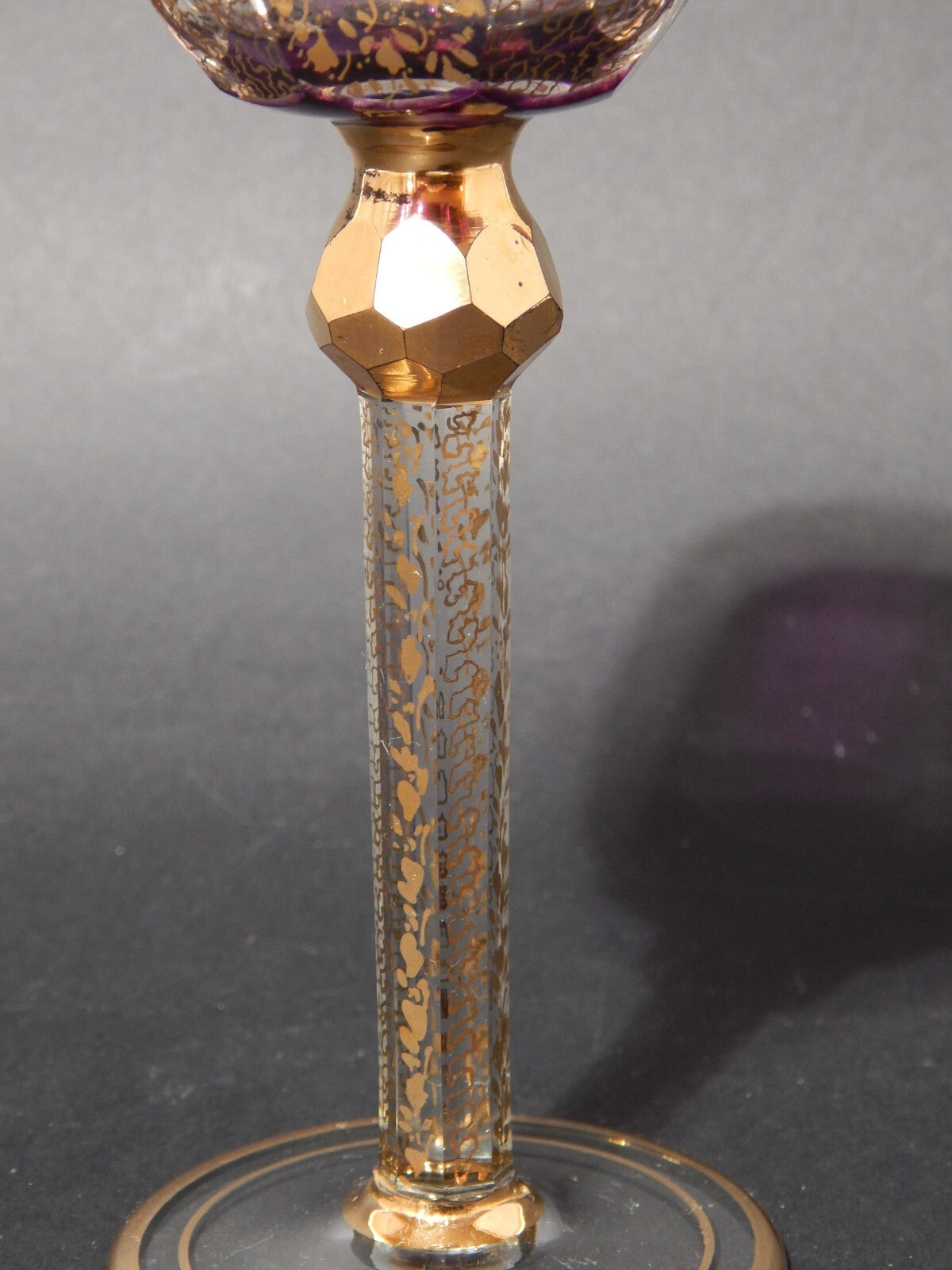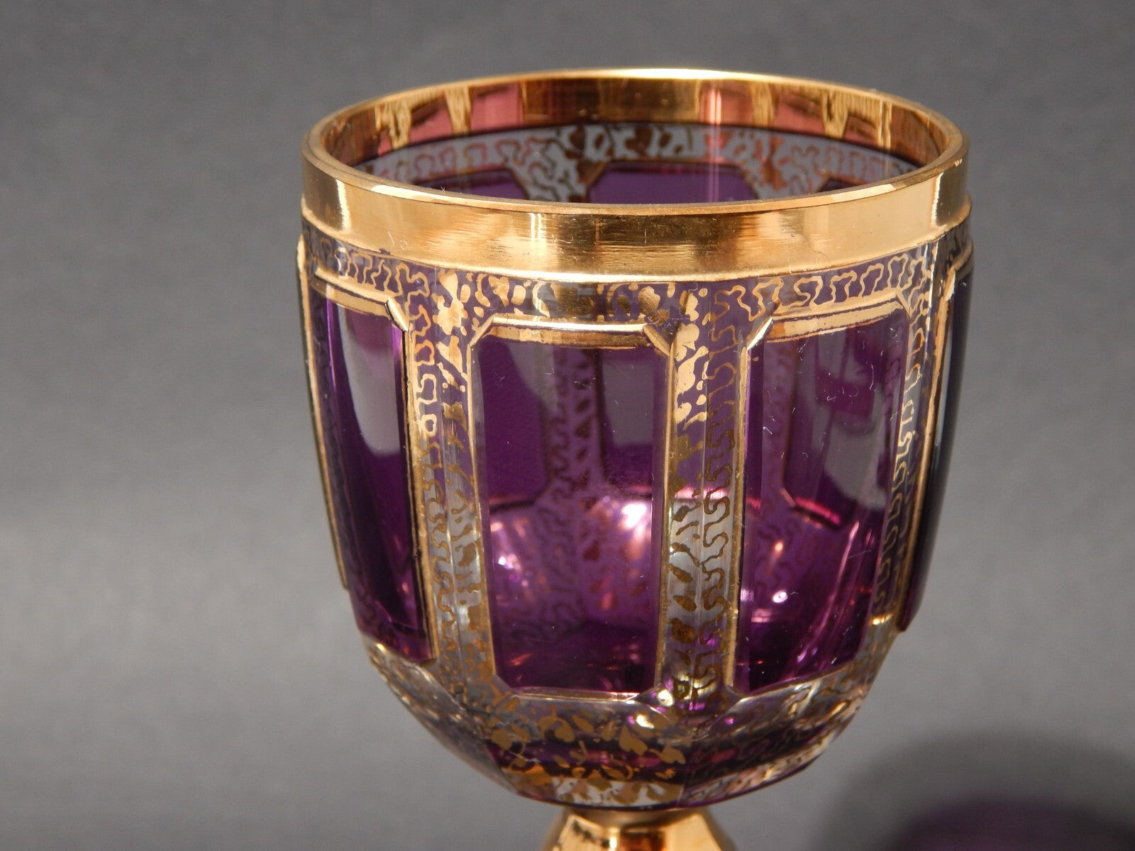 In questa inserzione viene presentato un prezioso bicchiere a calice di cristallo pesante con pannelli color ametista che poggia su uno stelo lungo di cristallo molato e decorato a mano in oro zecchino che poggia su una base rotonda con doppio bordo decorato in oro.