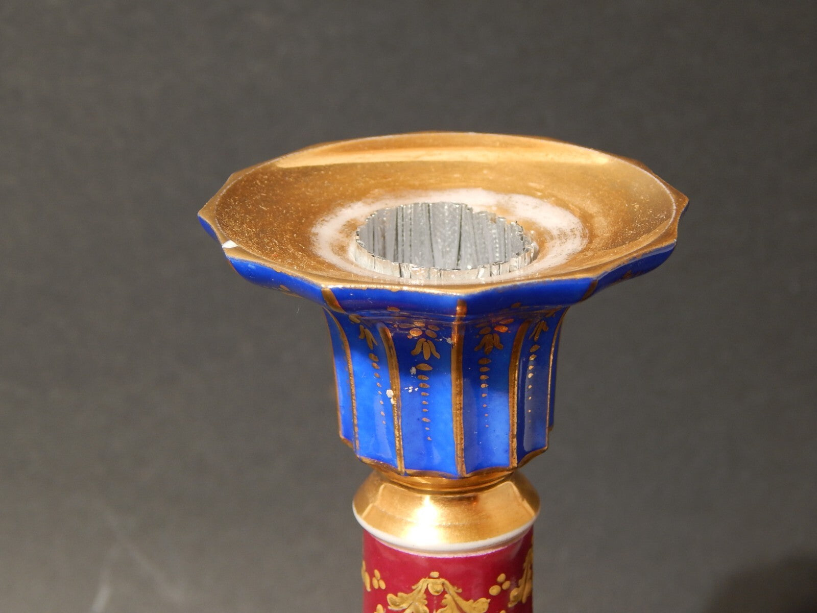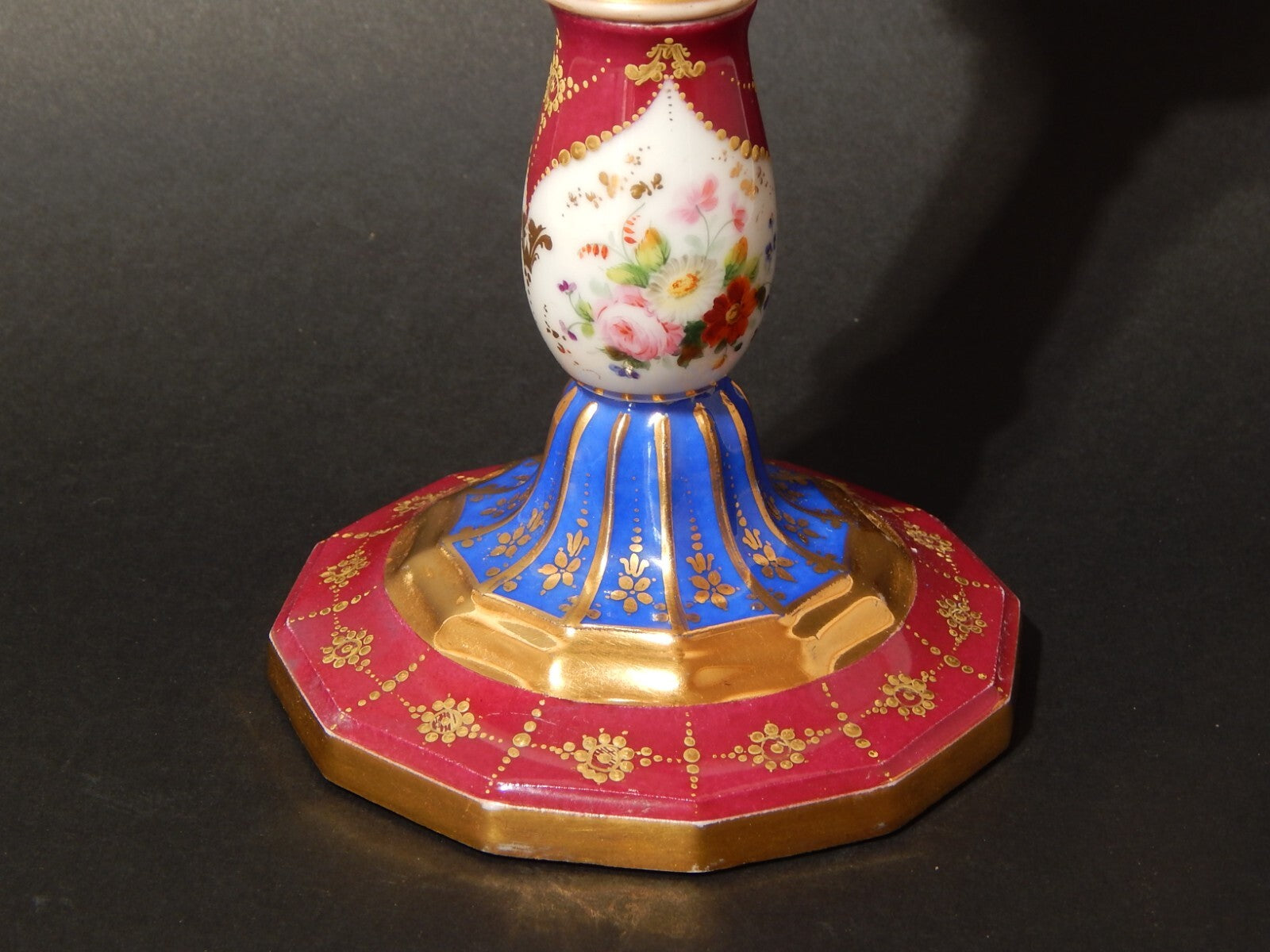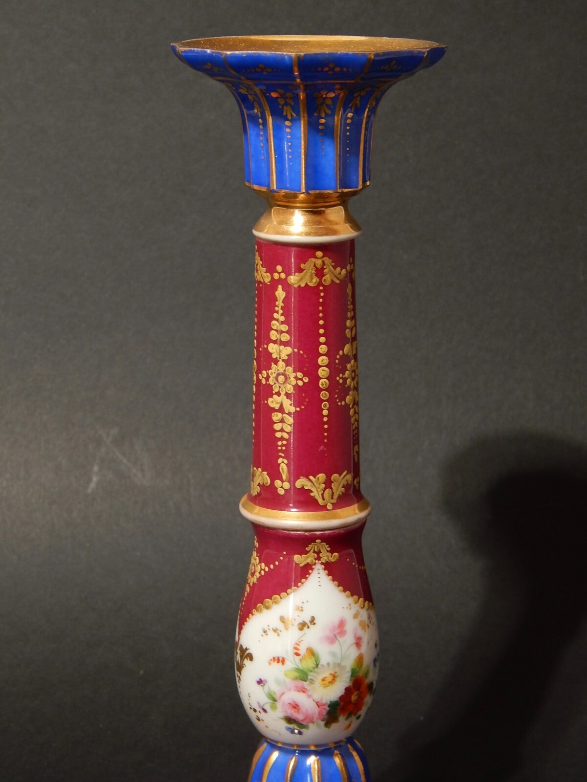 PREZIOSO ANTICO CANDELIERE PORCELLANA DECORO IN POLICROMA E ORO ZECCHINO