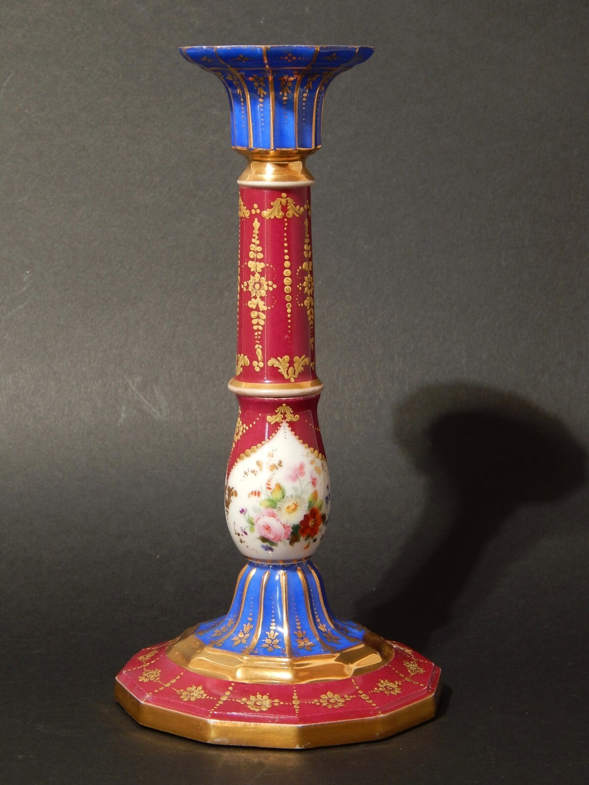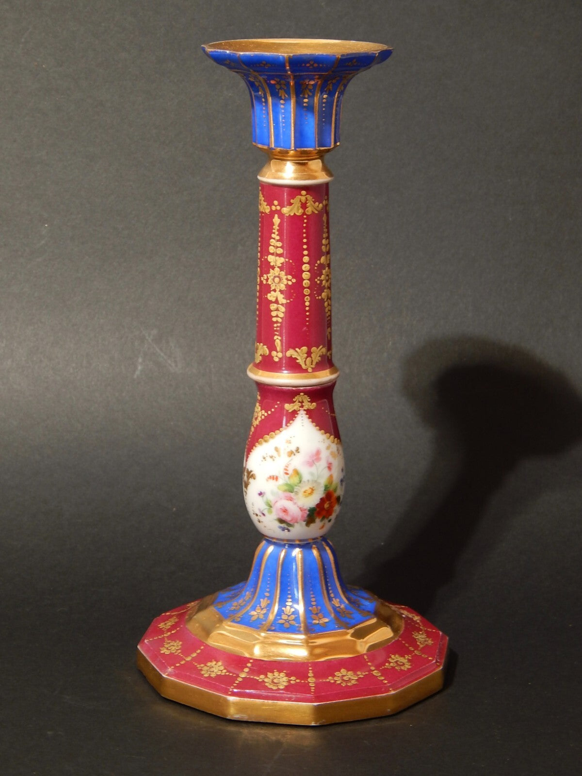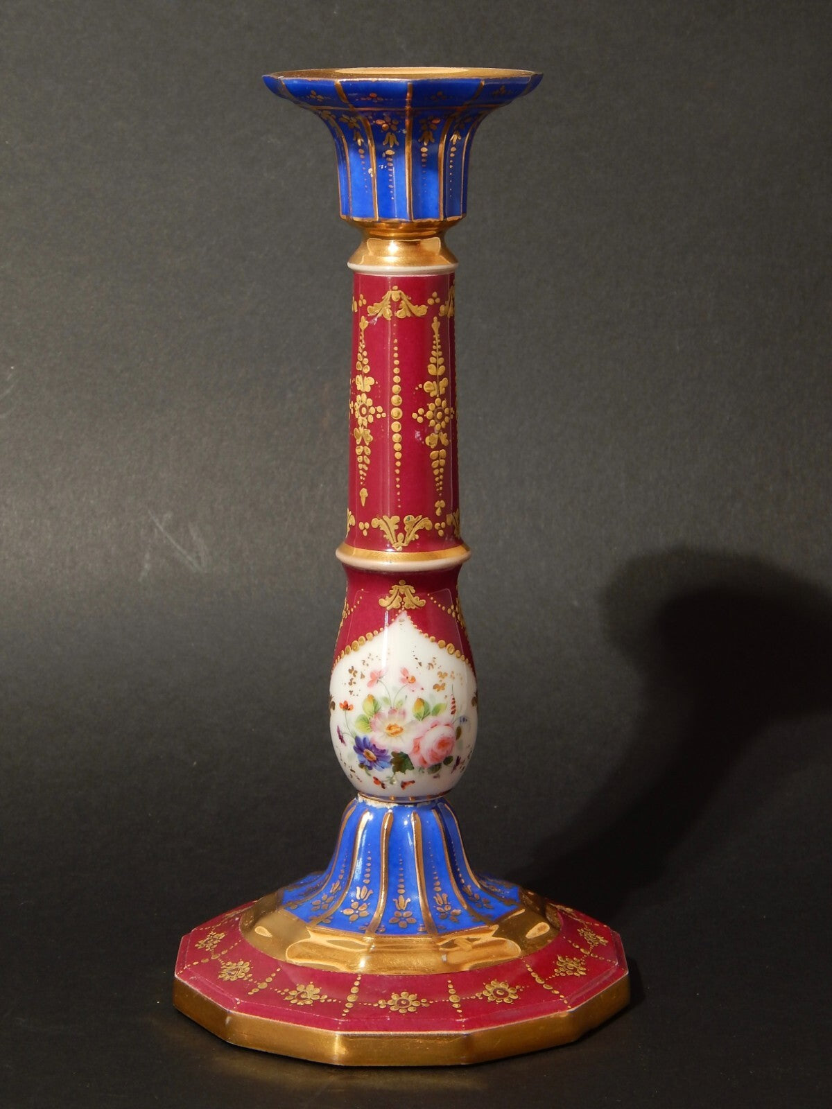PREZIOSO ANTICO CANDELIERE PORCELLANA DECORO IN POLICROMA E ORO ZECCHINO