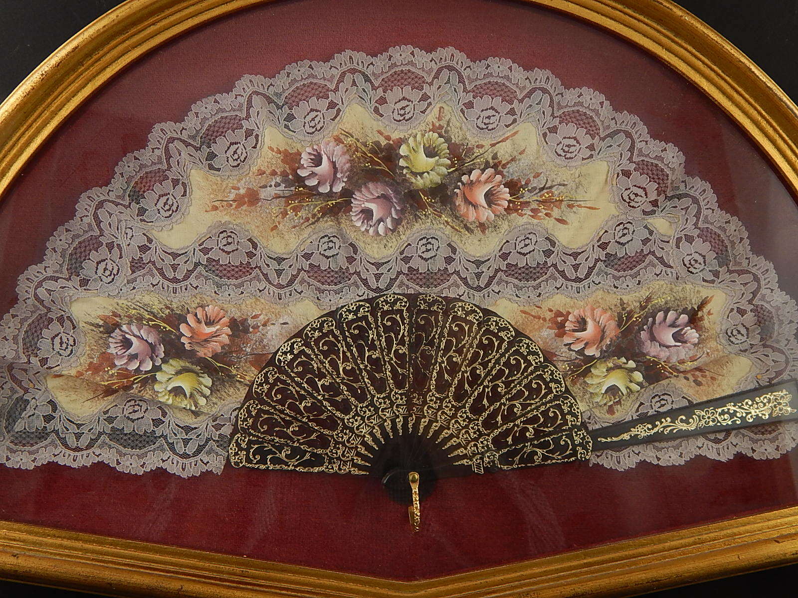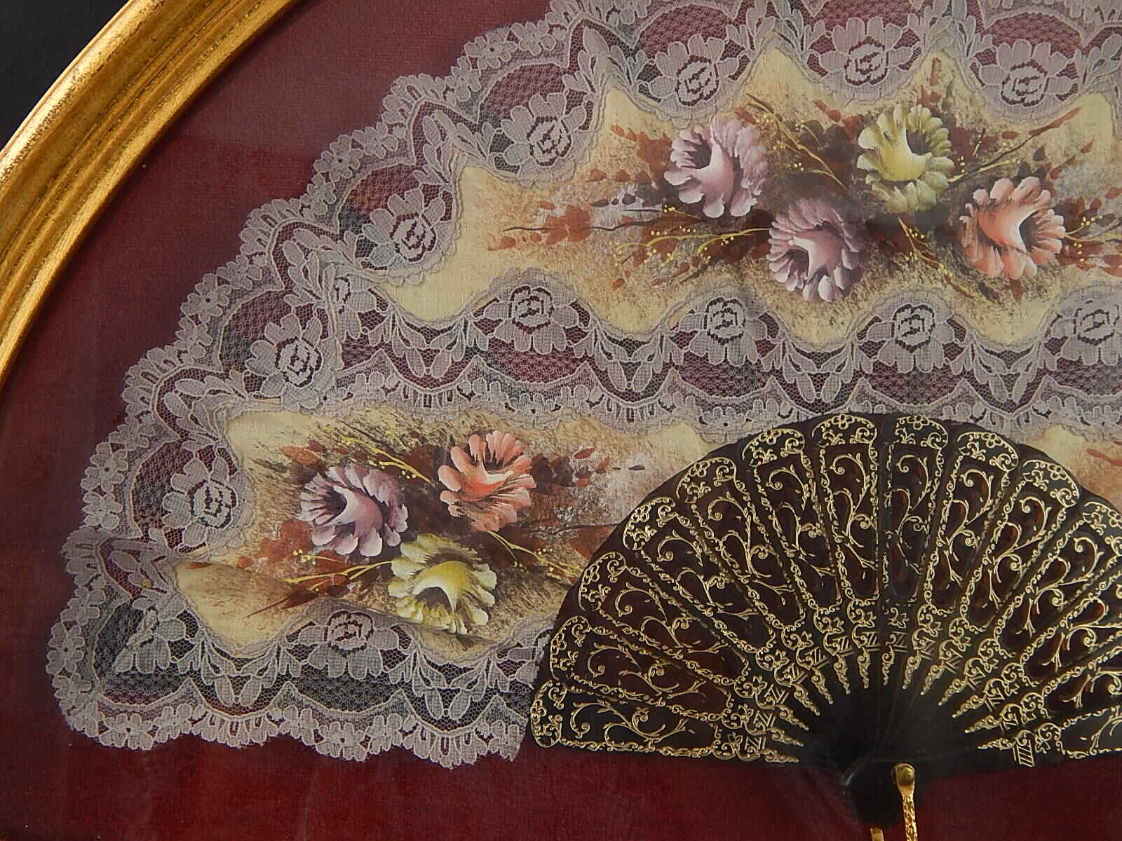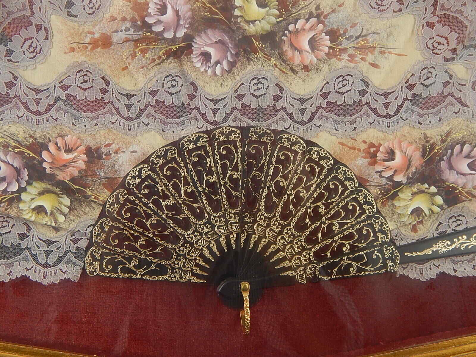 PREZIOSO ELEGANTE VENTAGLIO PIZZO E FIORI DIPINTI CON VENTAGLIERA COLLEZIONE