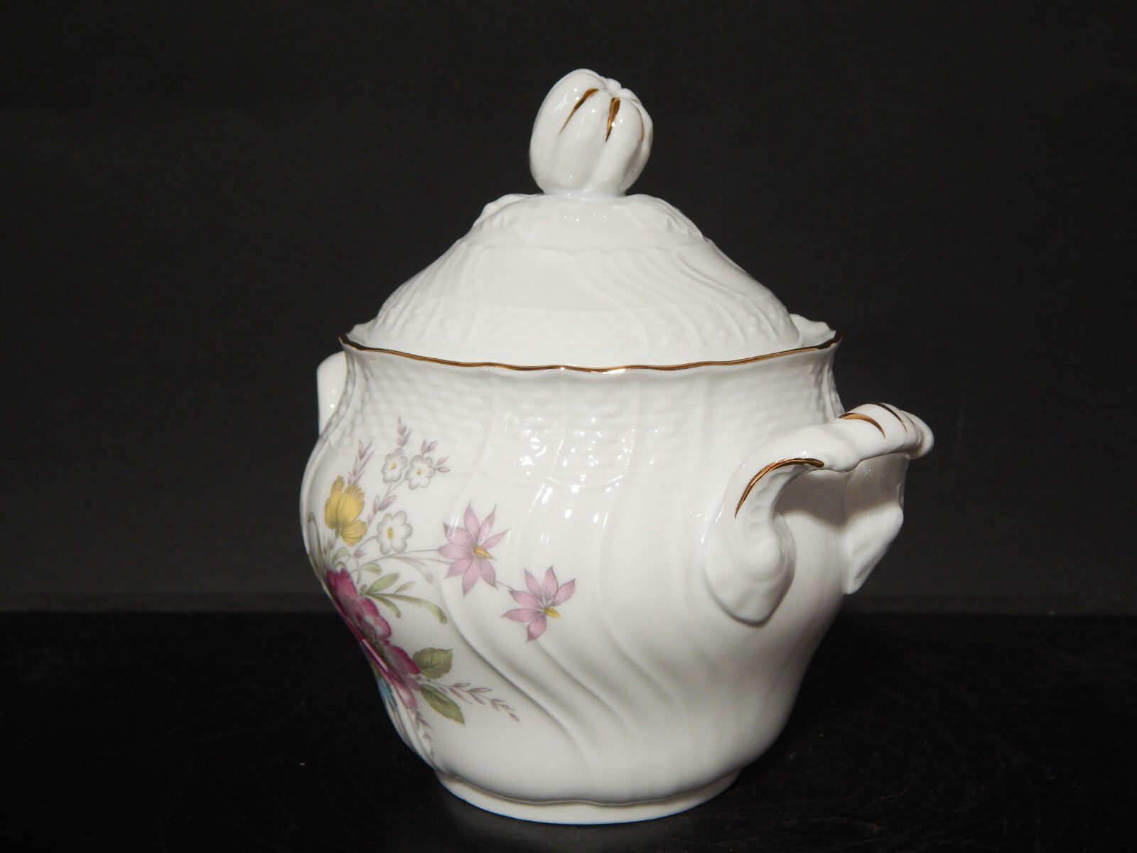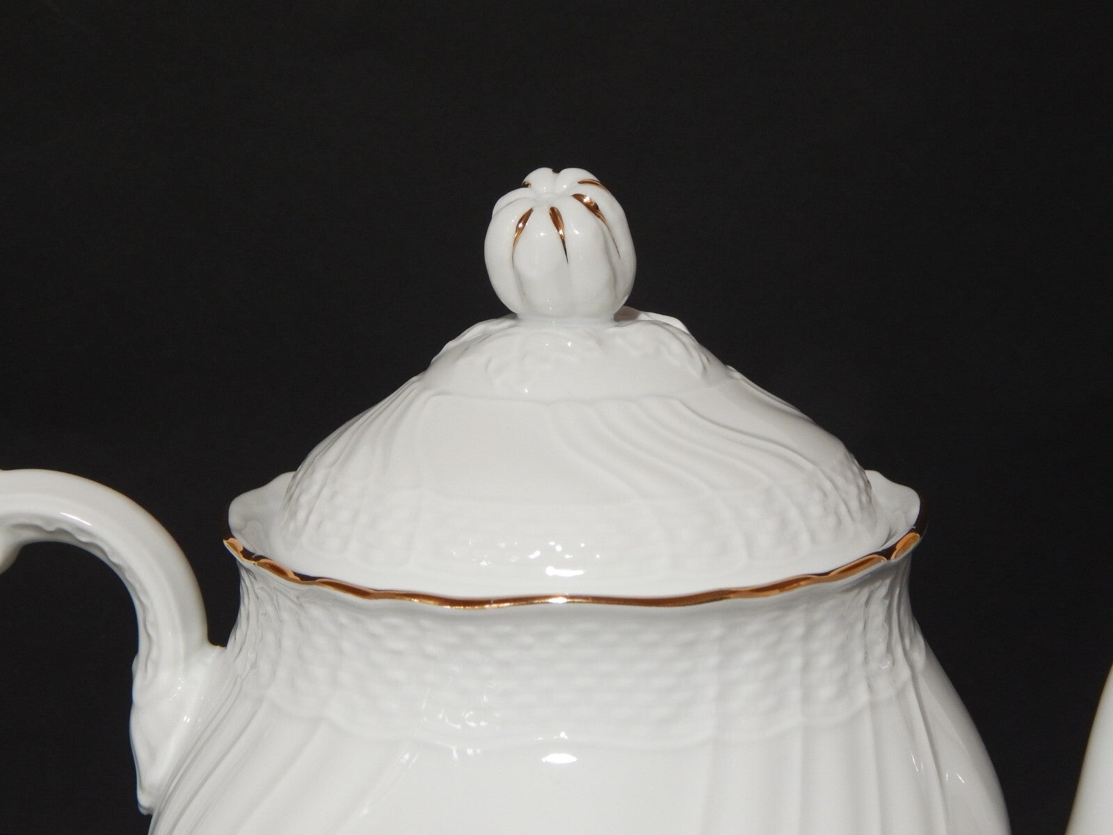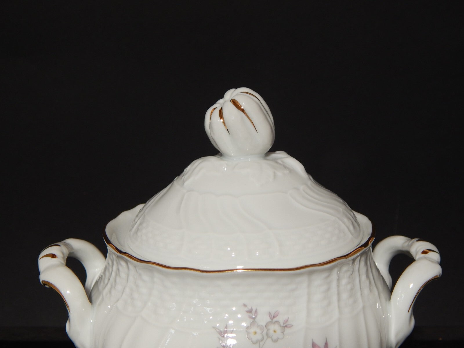 Il servizio realizzato nel modello "Vecchio Ginori" in porcellana bianca è decorato con motivi floreali policromi.