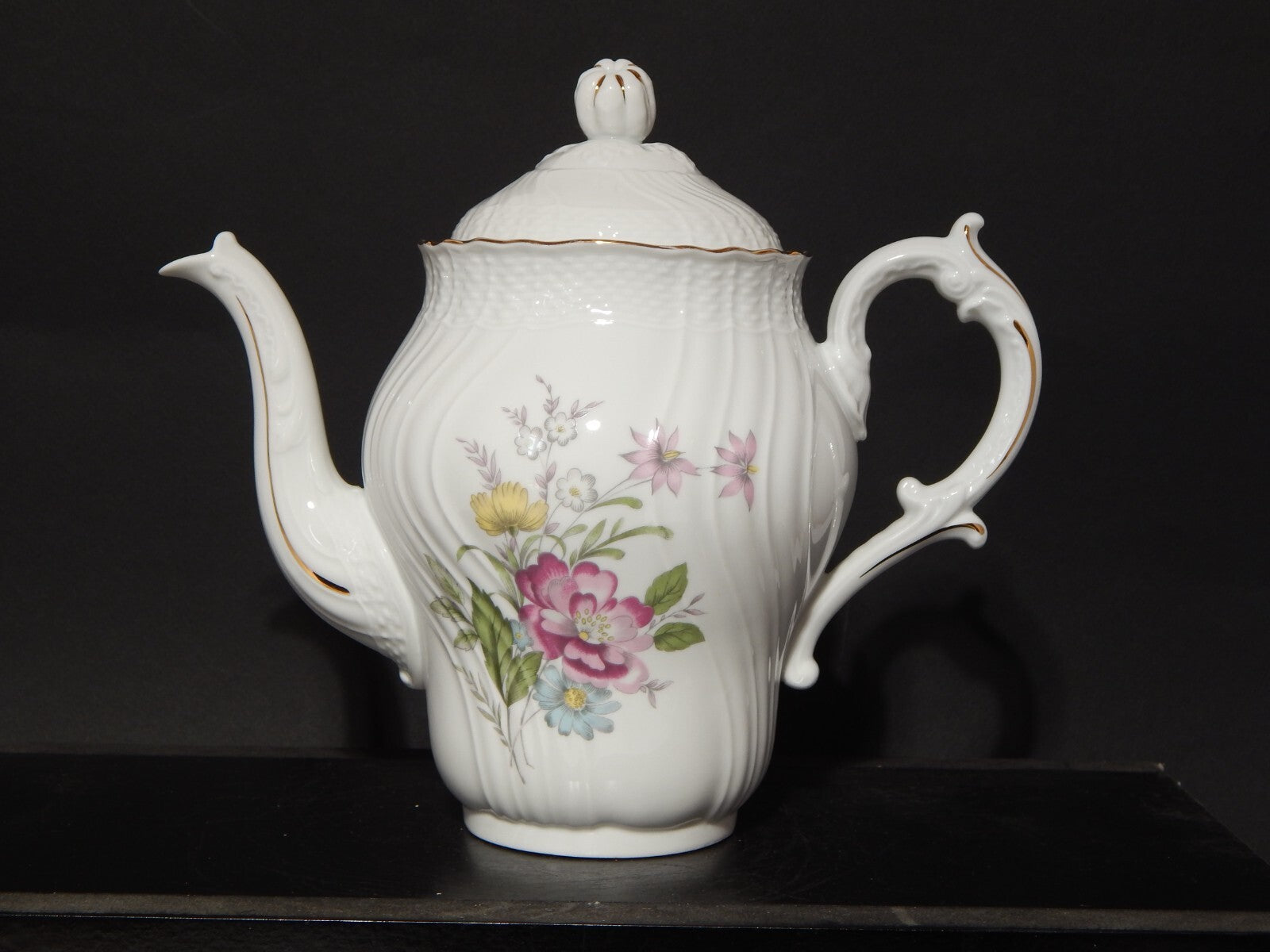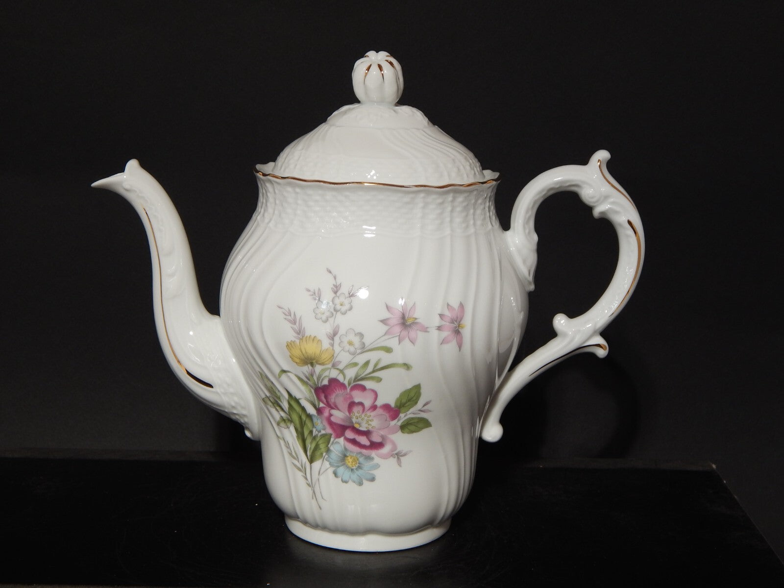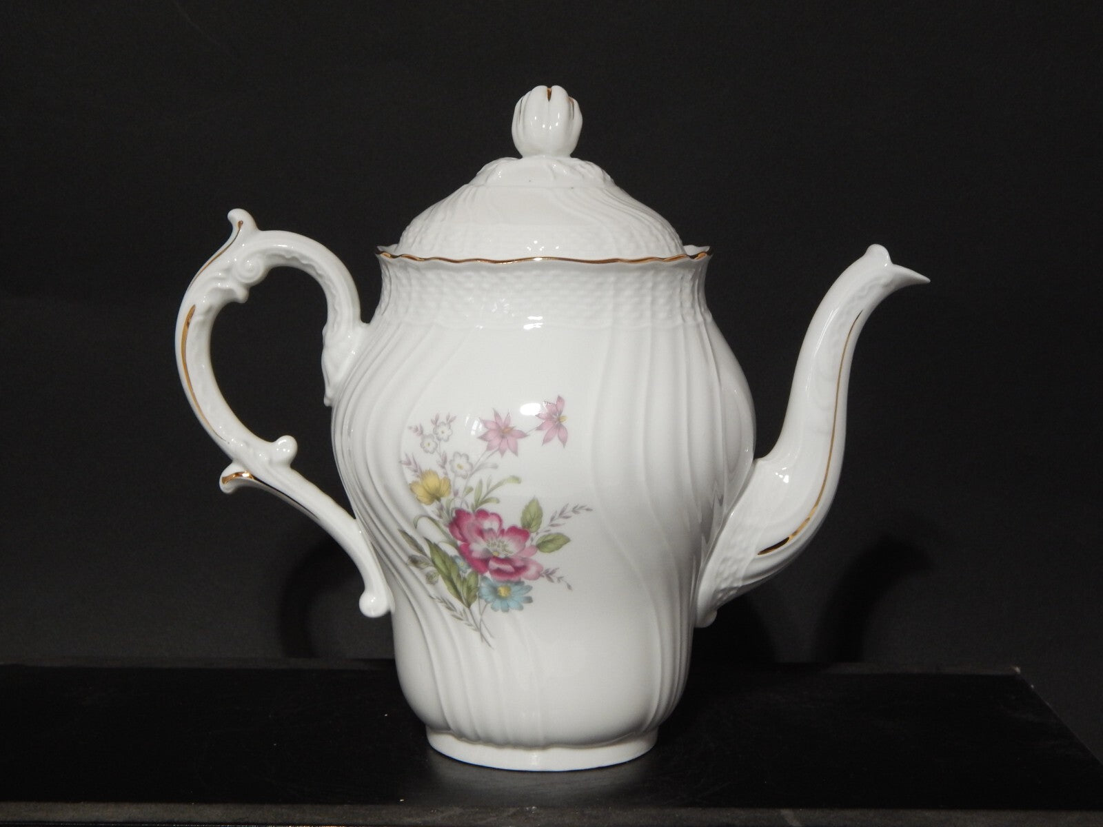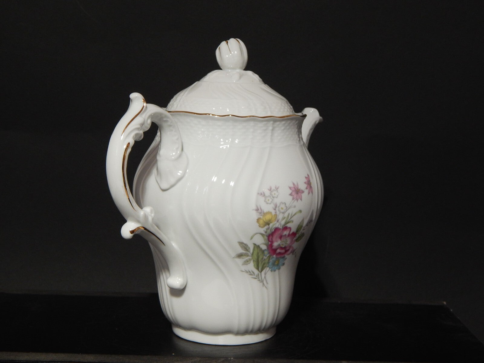 Il servizio realizzato nel modello "Vecchio Ginori" in porcellana bianca è decorato con motivi floreali policromi.