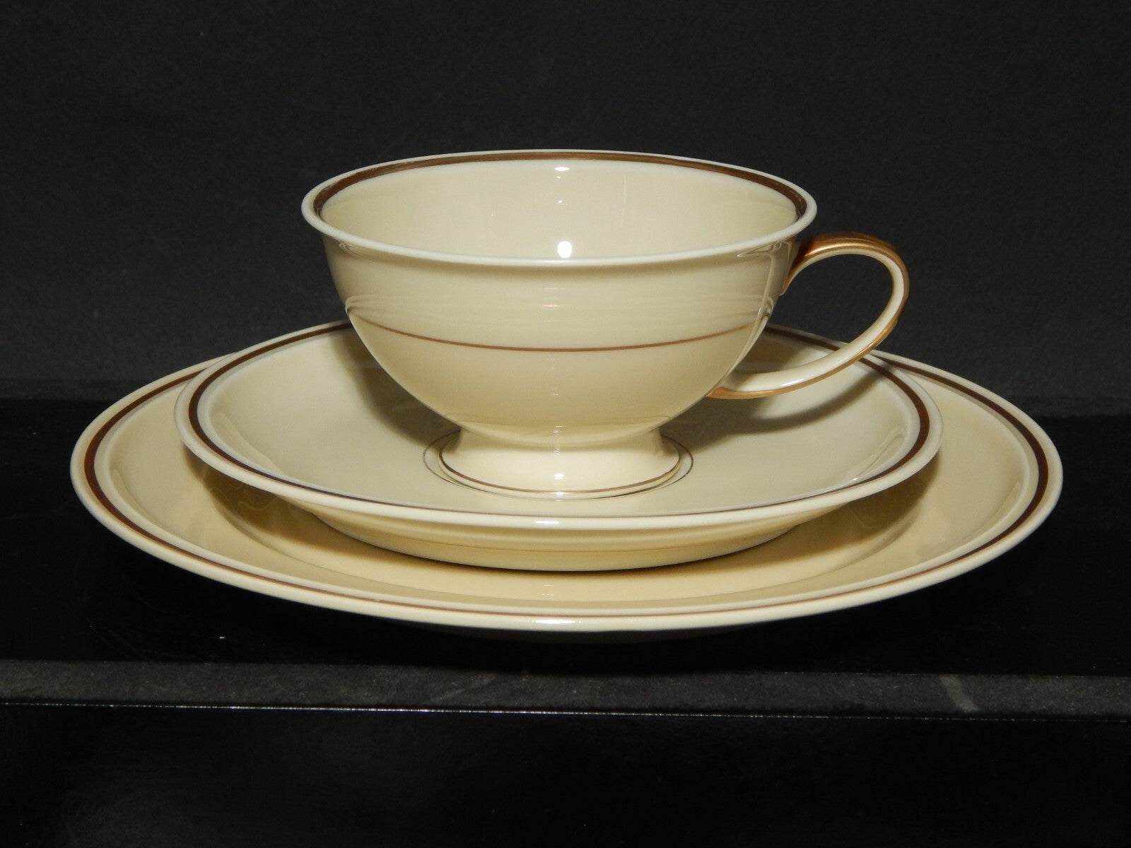 In questa inserzione viene presentato un trio in porcellana color avorio decorato in oro zecchino, realizzato dalla manifattura tedesca Rosenthal nel modello Winifred.