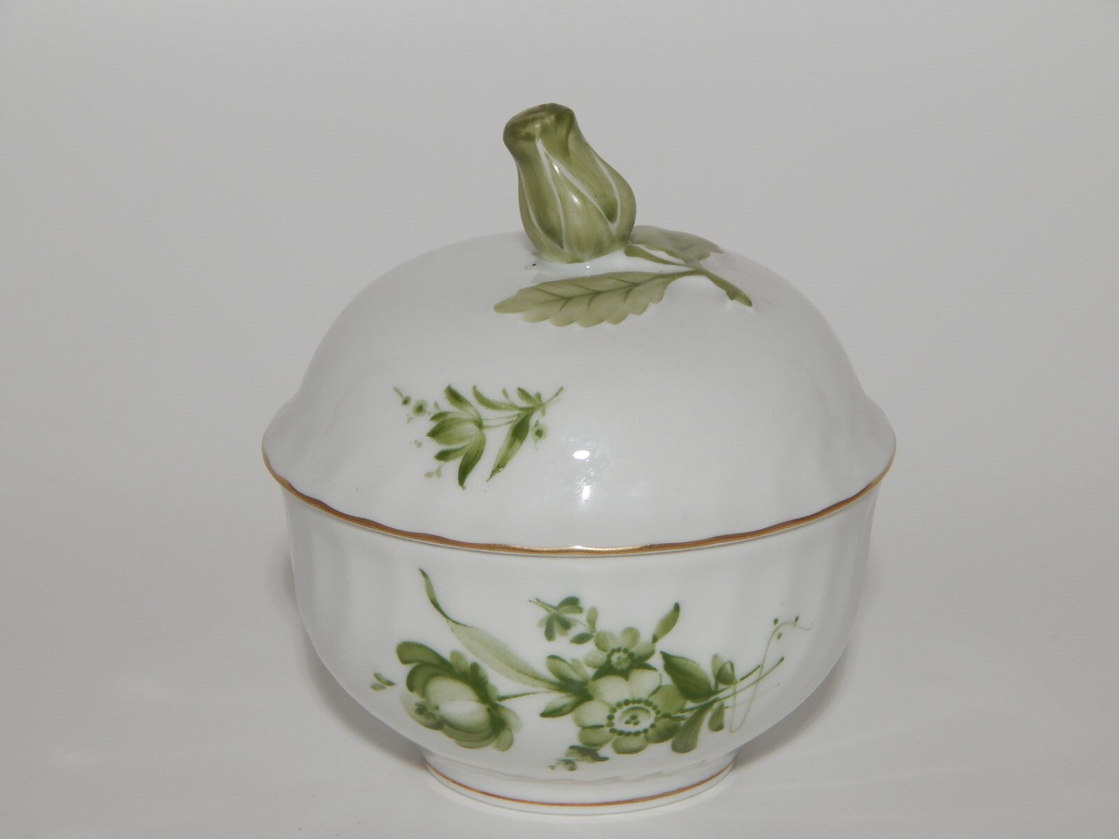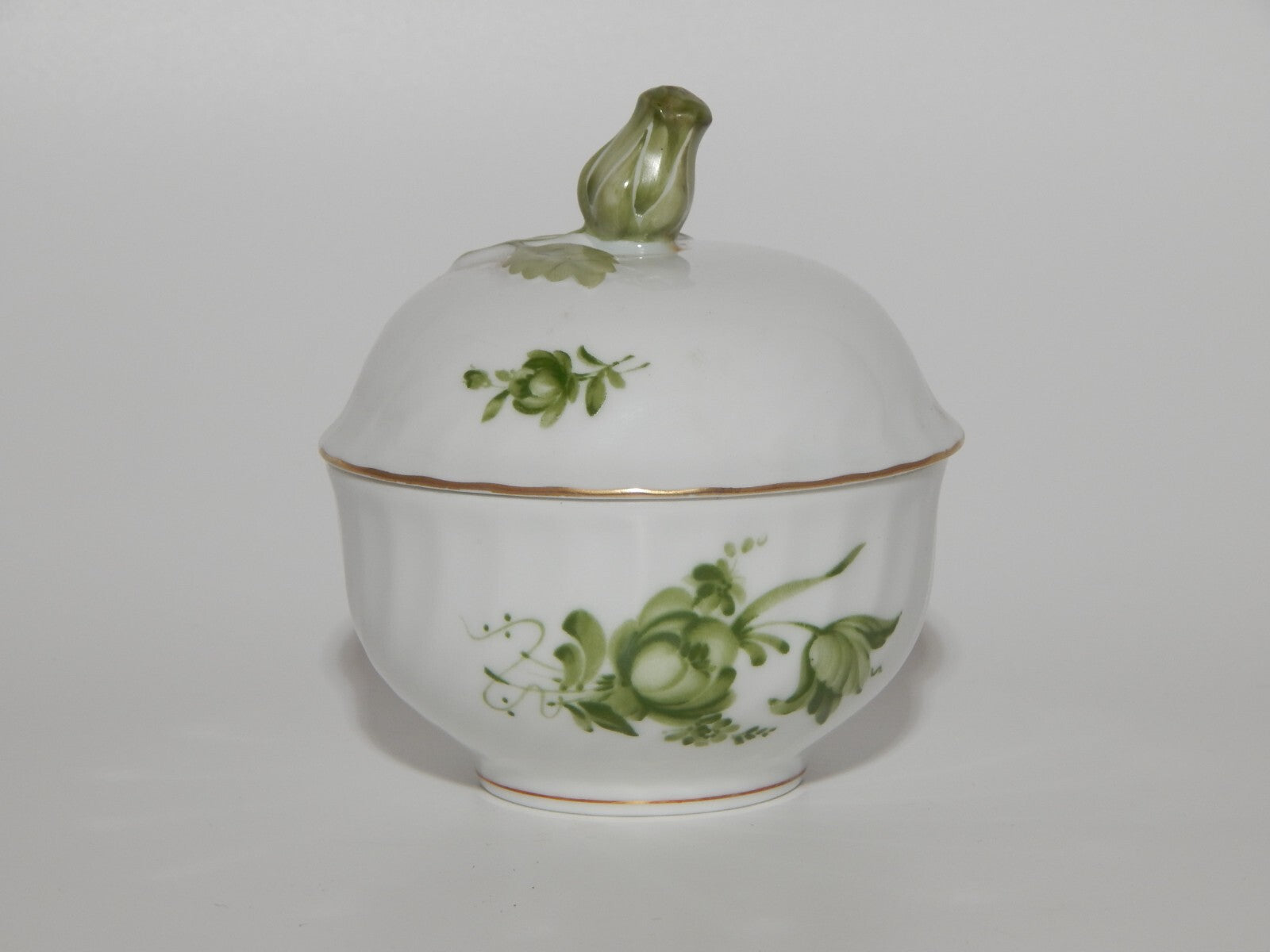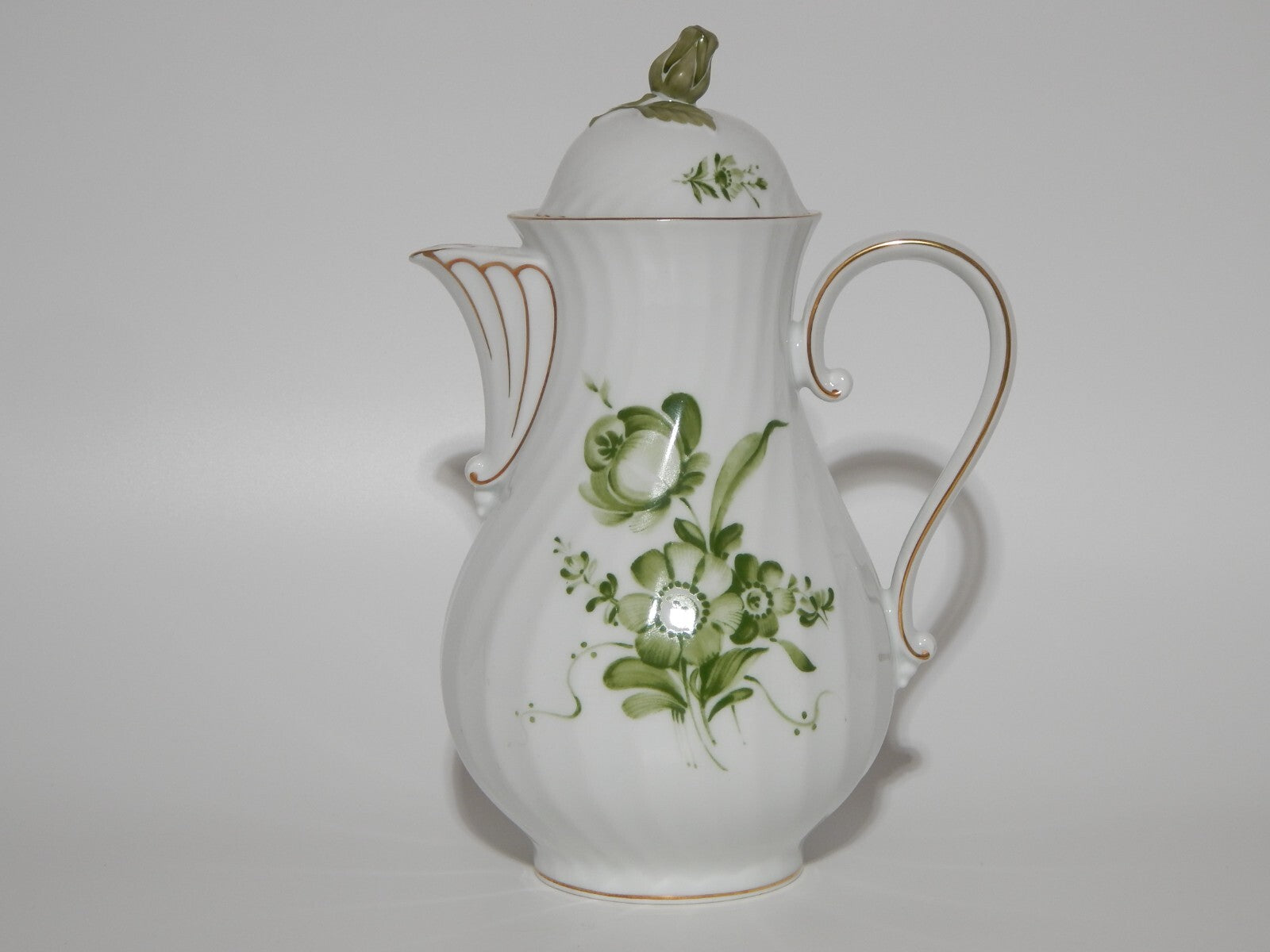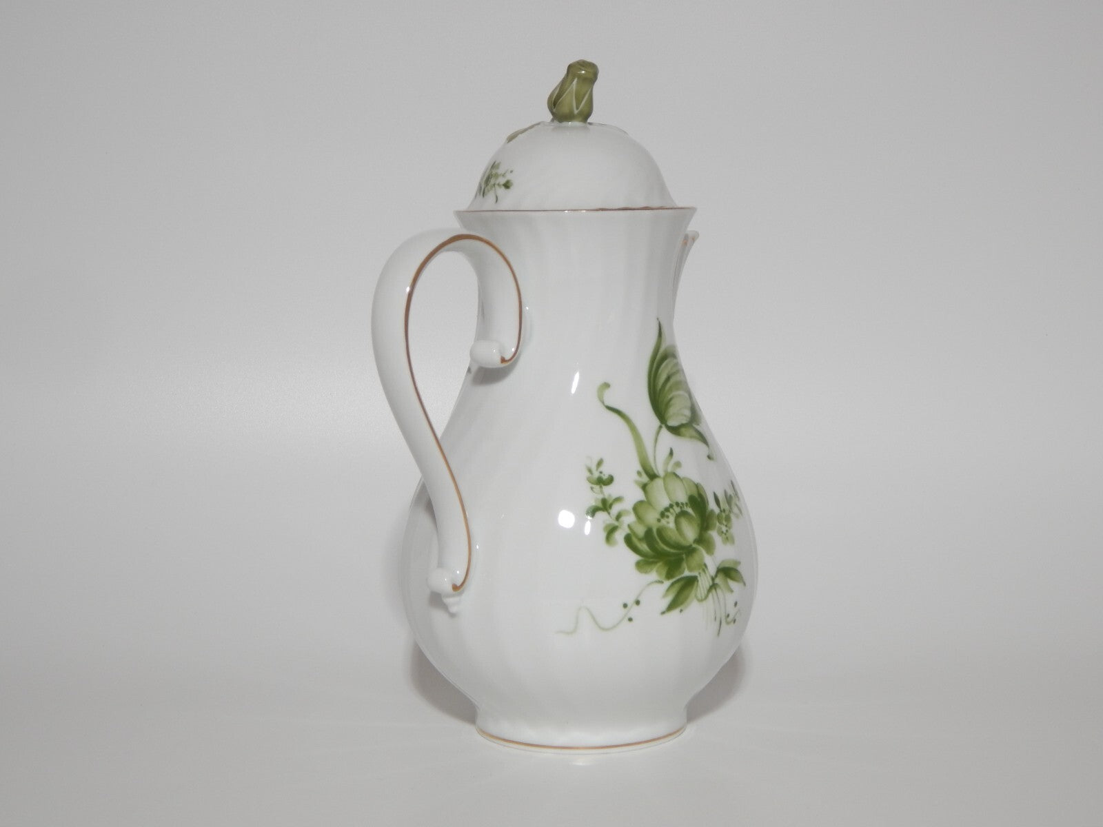In questa inserzione viene presentato un servizio da tè realizzato in porcellana bianca di altissima qualità decorato in verde e rifinito a mano in oro zecchino dalla manifattura tedesca Kaiser