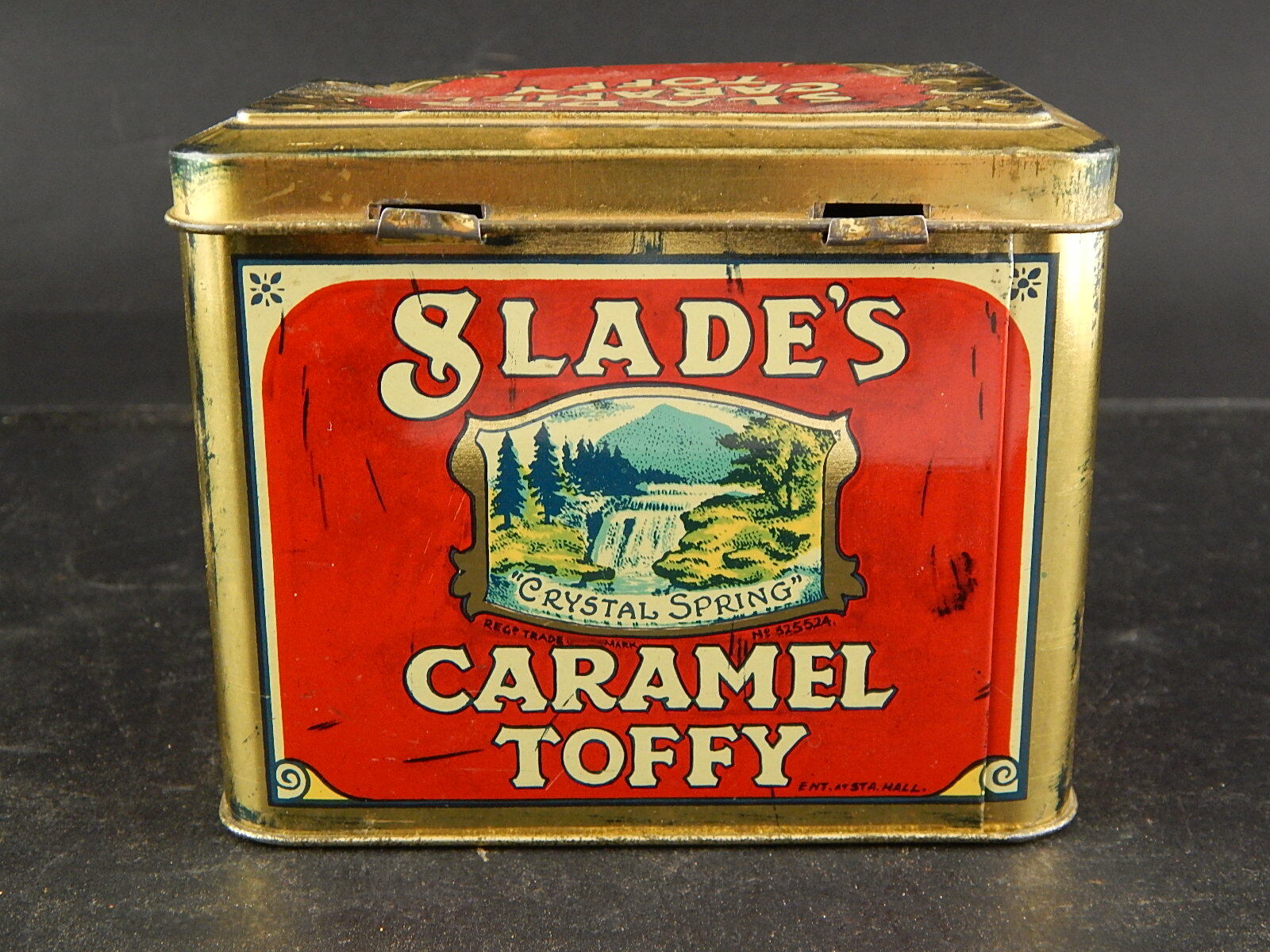 PUBBLICITARIO RARA VINTAGE SCATOLA LATTA MADE ENGLAND SLADE'S CARAMEL TOFFY