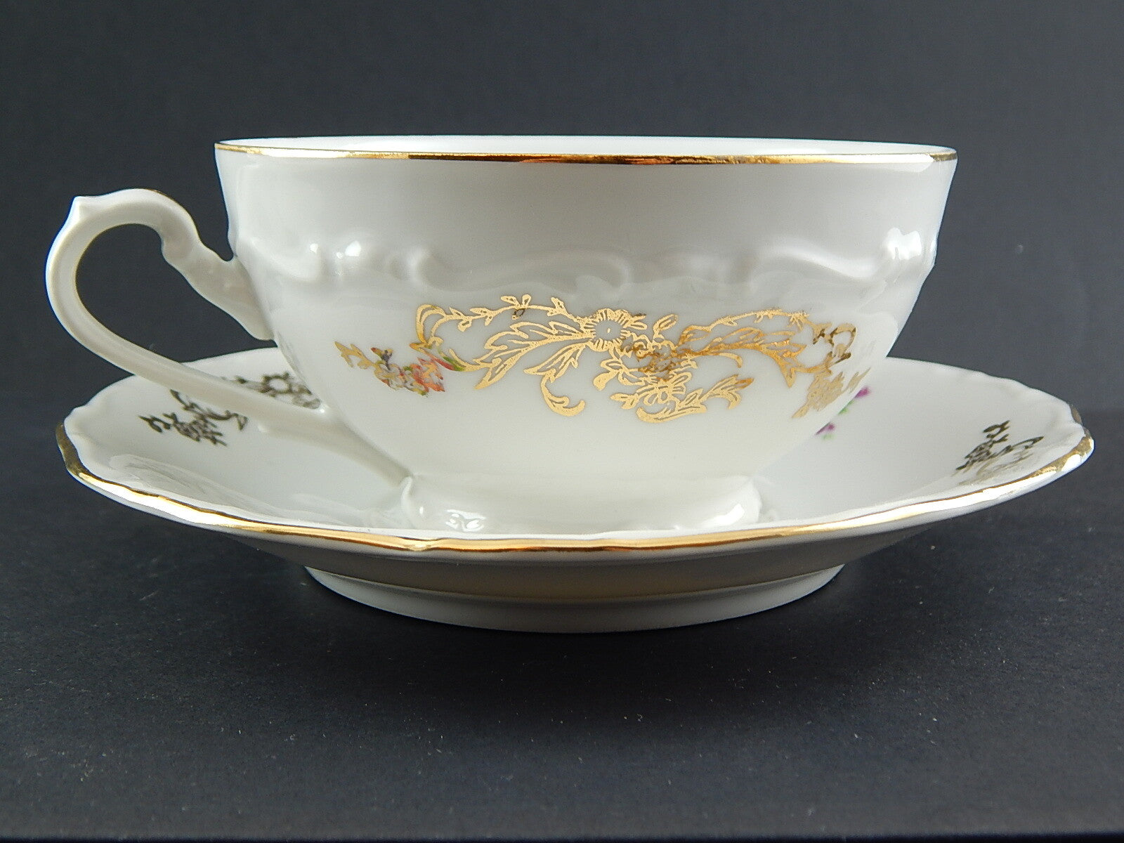In questa inserzione viene presentato un antico raro set da colazione composto da tazza e piattino in porcellana bianca e rifinito in oro realizzato da una manifattura Boema nella prima metà del 1900