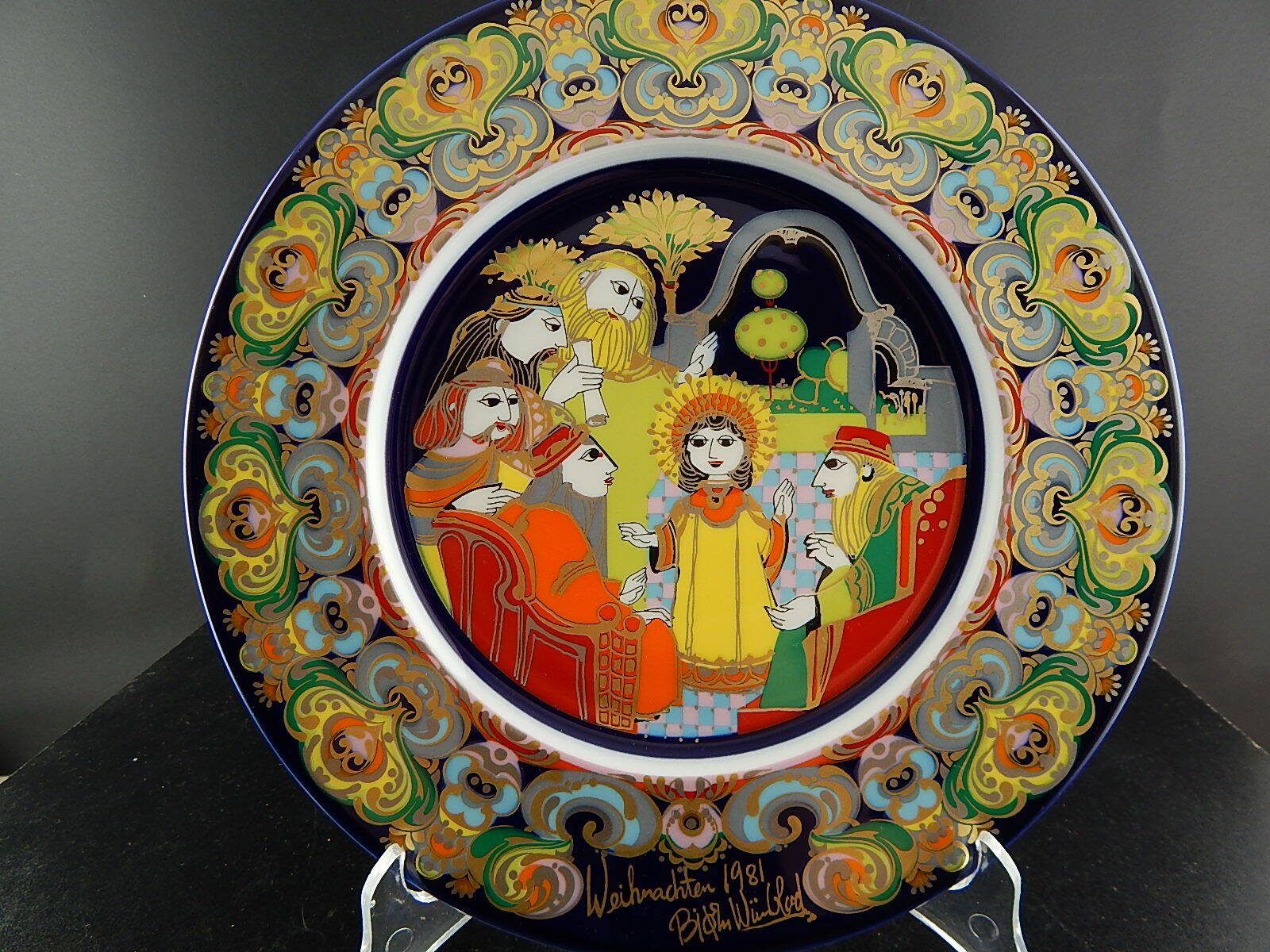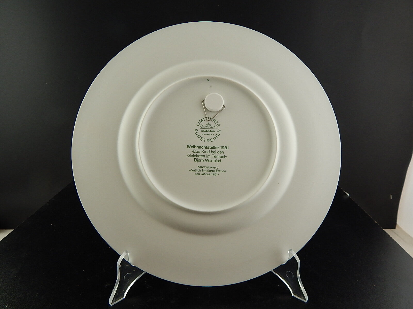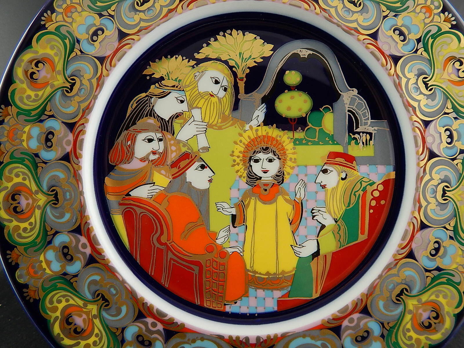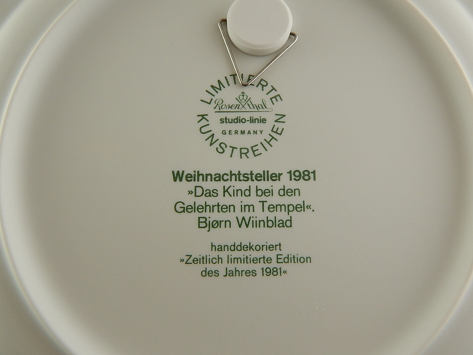 In questa inserzione è presentato il piatto di Natale del 1981 di Bjorn Wiinblad realizzato dalla manifattura tedesca Rosenthal; il piatto si intitola "Gesu' al Tempio" ed è l'undicesimo della serie. Ogni edizione di questi piatti di Natale mostra chiaramente l'intenzione dell'artista danese, Bjorn Wiinblad, di creare un sontuoso lavoro che ricordi gli antichi oggetti sacri dedicati al Natale. I vari colori, insieme con l'oro e l'argento, rendono questi piatti veri e preziosi oggetti da collezione.