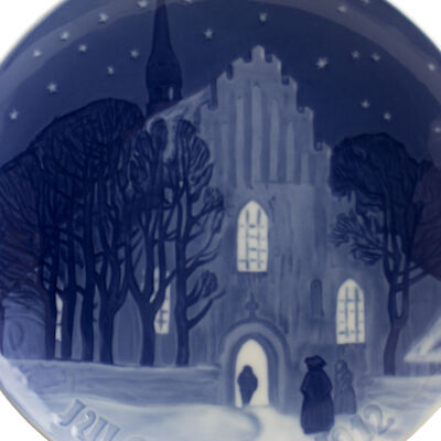 Il piatto di Natale del 1912 è il 18° della serie di famosi piatti Bing&Grondahl ed è intitolato “Going to Church on Christmas Eve”. Il motivo ornamentale è in rilievo e il piatto è decorato a mano nelle classiche sfumature blu cobalto applicate sottosmalto.