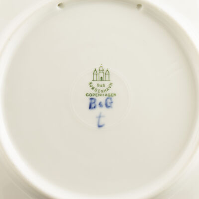 A garanzia di autenticità il piatto reca il marchio della Bing&Grondahl con le tre torri, ispirato allo stemma della città di Copenhagen, e le iniziali del pittore.