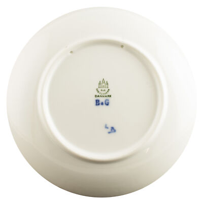 A garanzia di autenticità il piatto reca il marchio della Bing&Grondahl con le tre torri, ispirato allo stemma della città di Copenhagen, e le iniziali del pittore.