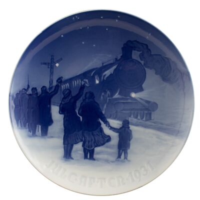 Il piatto di Natale del 1931 è il 37° della serie di famosi piatti Bing&Grondahl ed è intitolato “Arrival of the Christmas Train”. Il motivo ornamentale è in rilievo e il piatto è decorato a mano nelle classiche sfumature blu cobalto applicate sottosmalto.