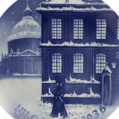 Il piatto di Natale del 1936 è il 42° della serie di famosi piatti Bing&Grondahl ed è intitolato “Royal Guard Outside Amalienborg Castle in Copenhagen”. Il motivo ornamentale è in rilievo e il piatto è decorato a mano nelle classiche sfumature blu cobalto applicate sottosmalto.