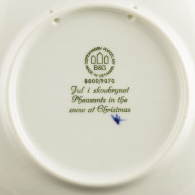 Il piatto di Natale del 1970 è il 76° della serie di famosi piatti Bing&Grondahl ed è intitolato “Pheasants in the Snow of Christmas”. Il motivo ornamentale è in rilievo ed il piatto è decorato a mano nelle classiche sfumature blu cobalto applicate sottosmalto.