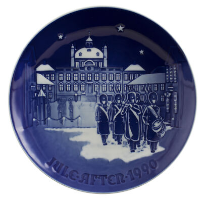 Il piatto di Natale del 1990 è il 96° della serie di famosi piatti Bing&Grondahl ed è intitolato “Changing of the Guards”. Il motivo ornamentale è in rilievo e il piatto è decorato a mano nelle classiche sfumature blu cobalto applicate sottosmalto.