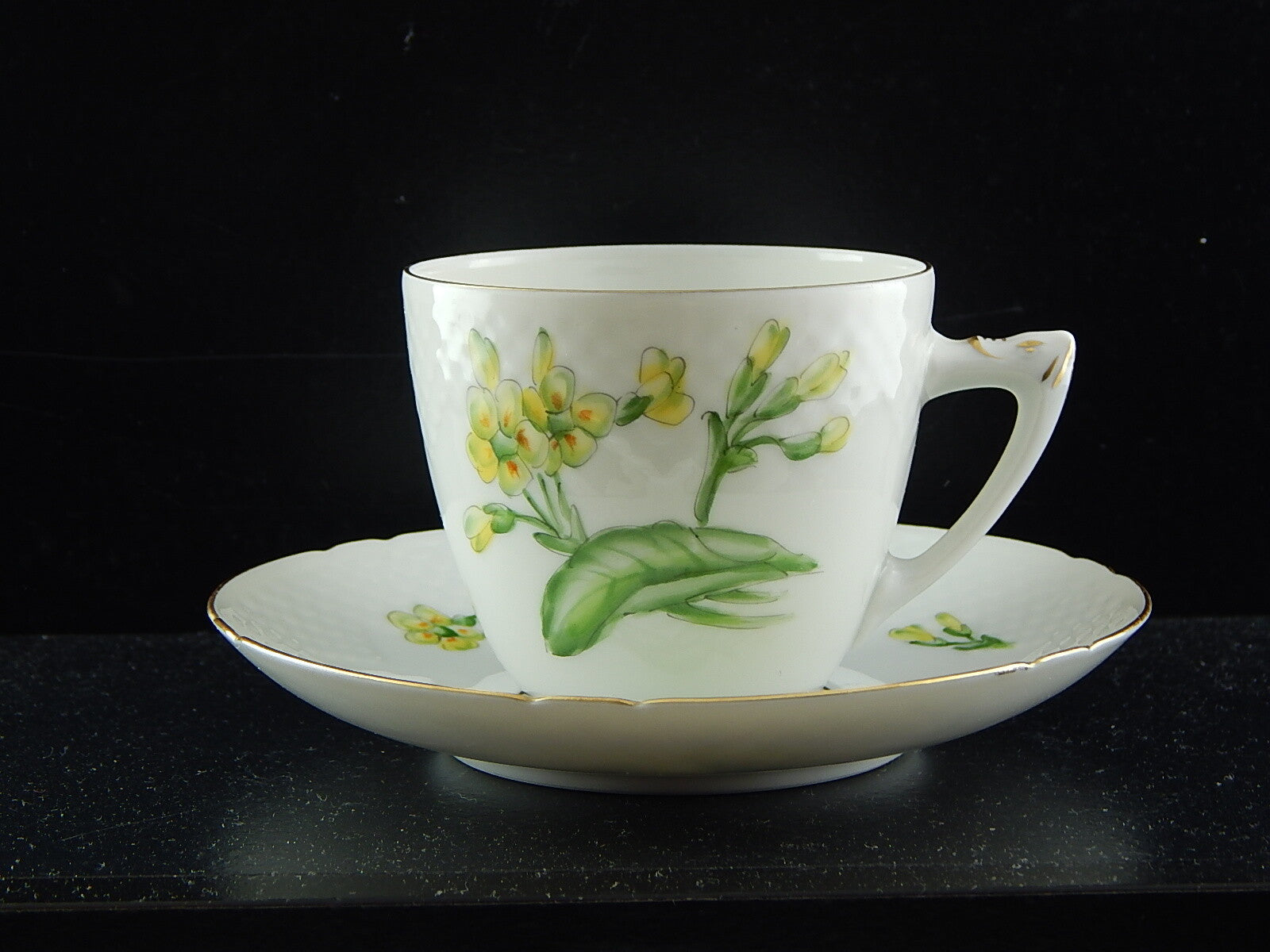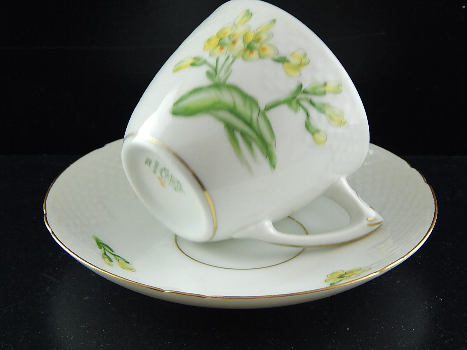 Ogni tazzina e ogni piattino sono un pezzo unico perché sono stati dipinti a pennello sotto smalto. Sono rifiniti in oro zecchino. Essendo oggetti vintage possono mostrare piccoli segni del tempo, come ad esempio una disomogeneità nella decorazione dell’oro.