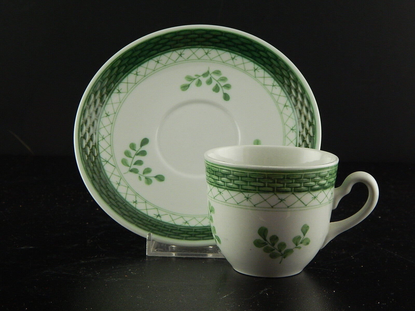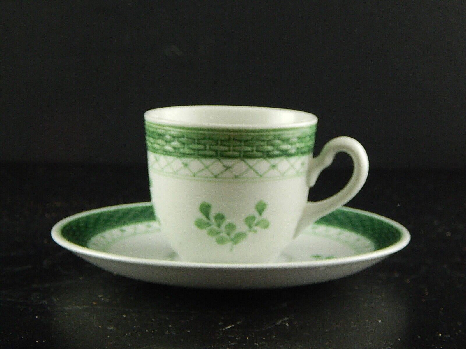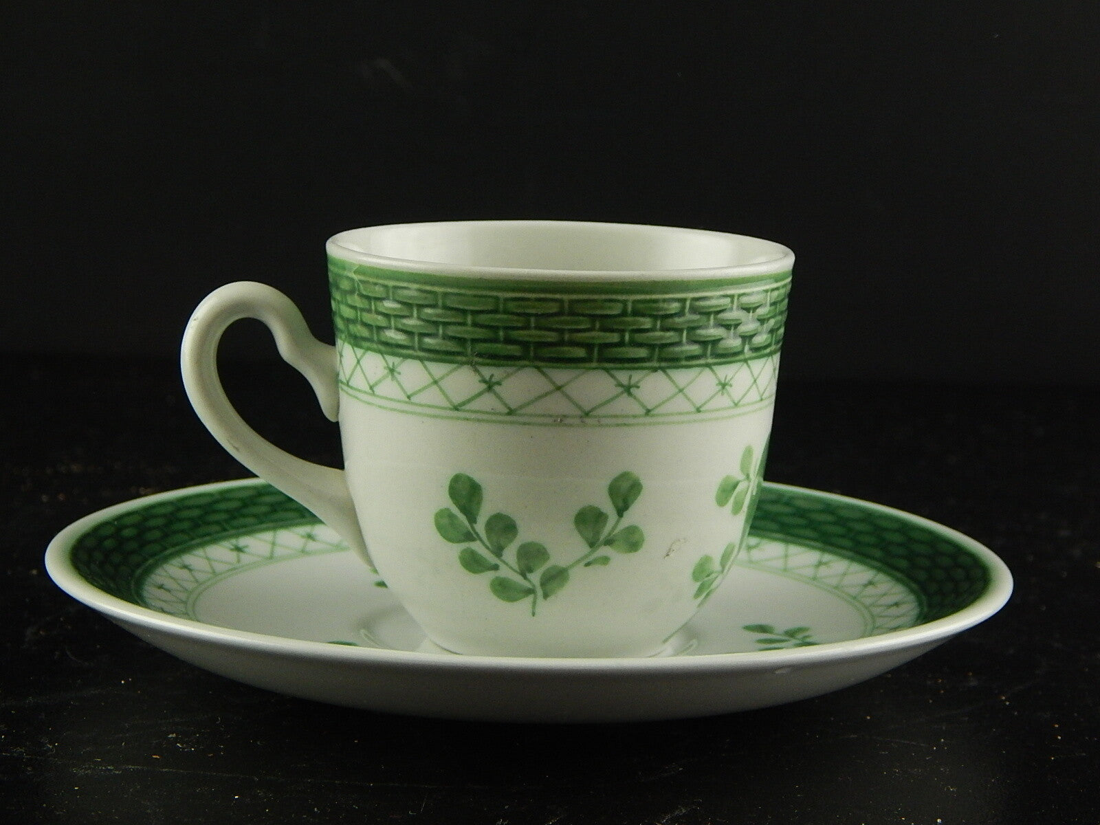 In questa inserzione viene presentata una tazza in ceramica con relativo piattino della collezione Green Flower prodotta dalla Royal Copenhagen.