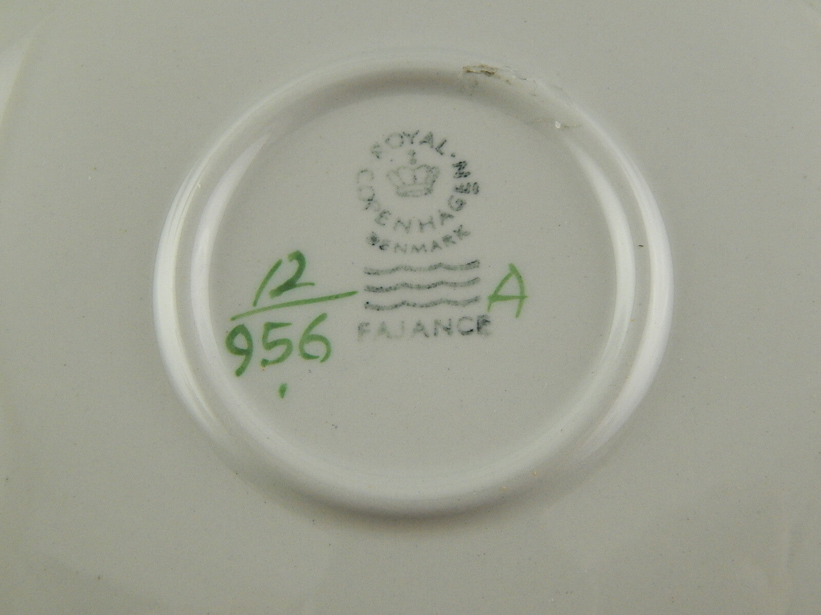 A garanzia di autenticità la tazza è il piattino recano il marchio della Royal Copenhagen, la Corona sopra le tre Linee Ondulate, e le iniziali del pittore.