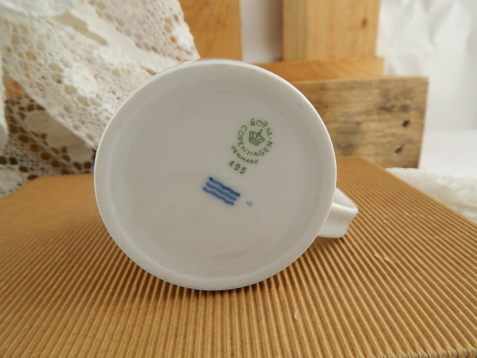 A garanzia di autenticità la tazza reca il marchio della Royal Copenhagen, la Corona sopra le tre Linee Ondulate, e le iniziali. La tazza misura cm. 8 di altezza e cm. 7 di diametro è nuova con la sua scatola originale