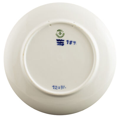 A garanzia di autenticità il piatto reca il marchio della Royal Copenhagen, la Corona sopra le tre Linee Ondulate e le iniziali del pittore.